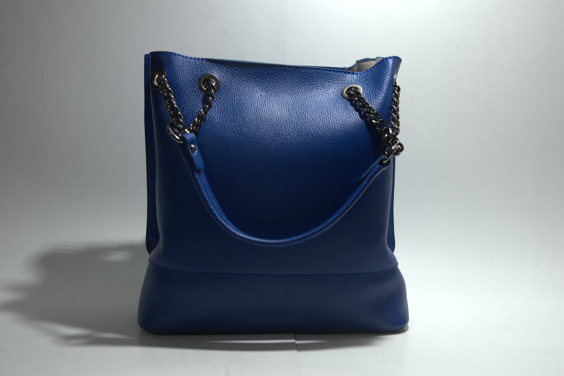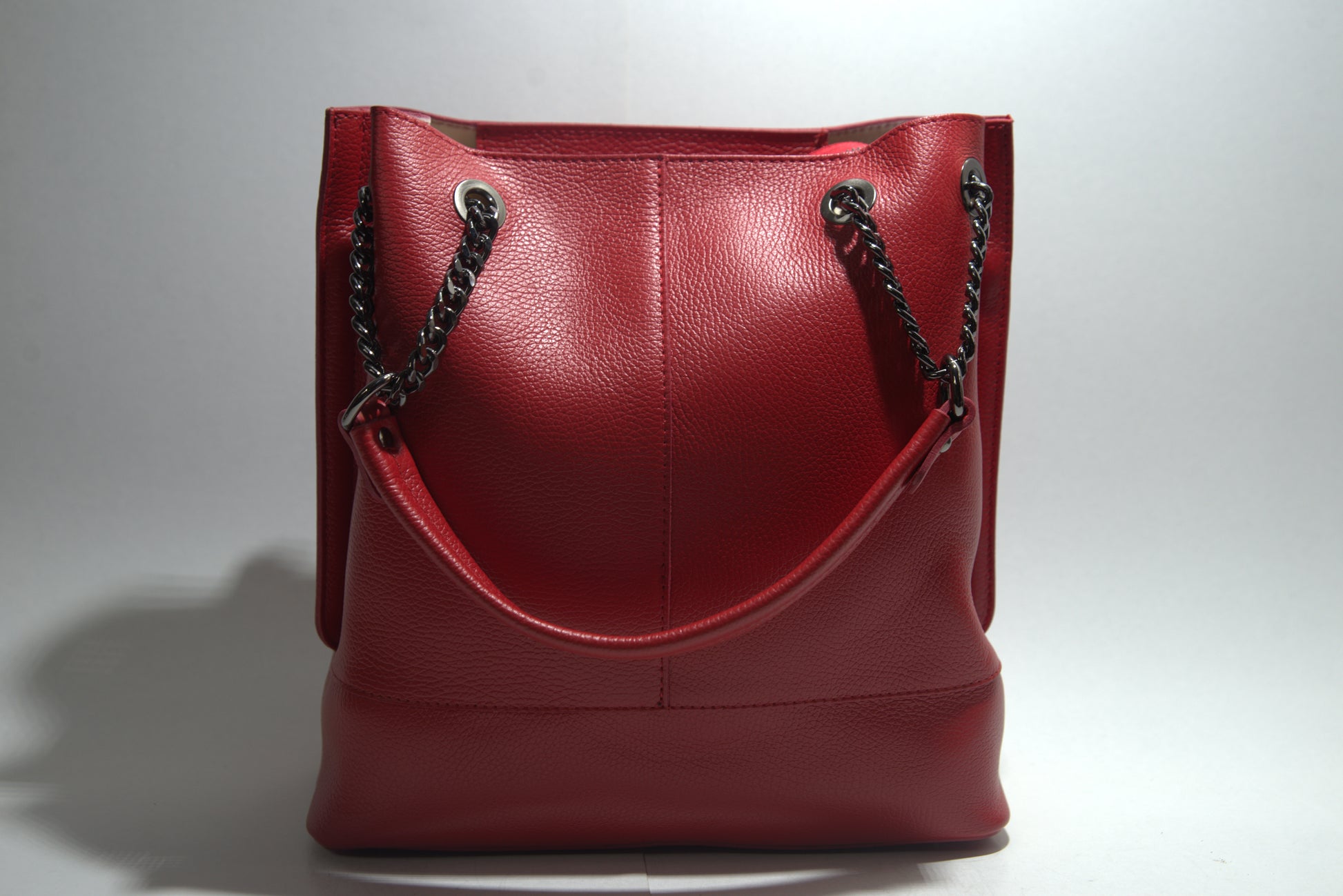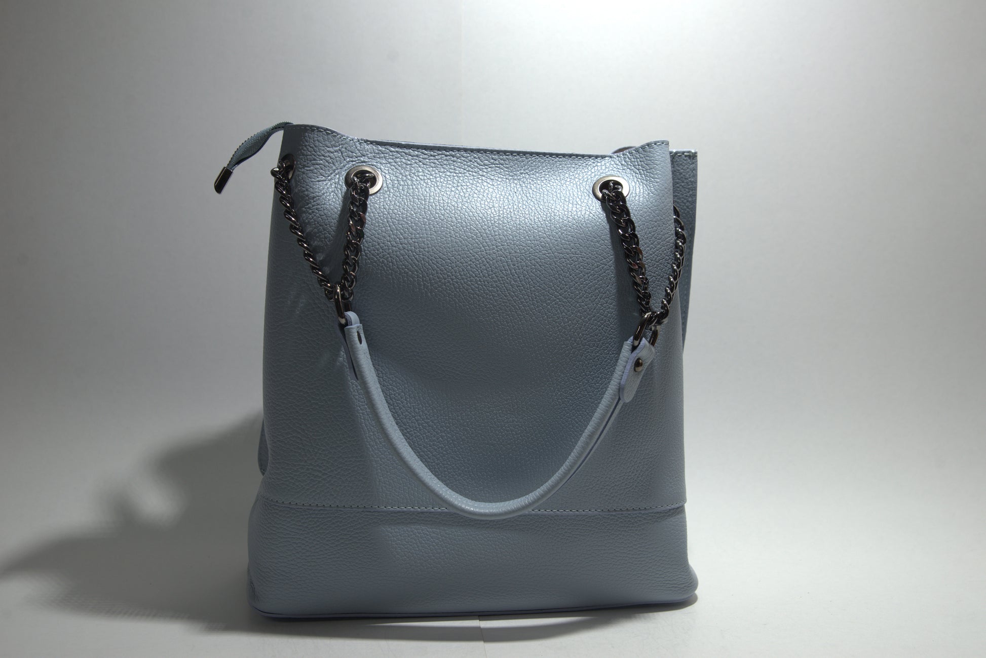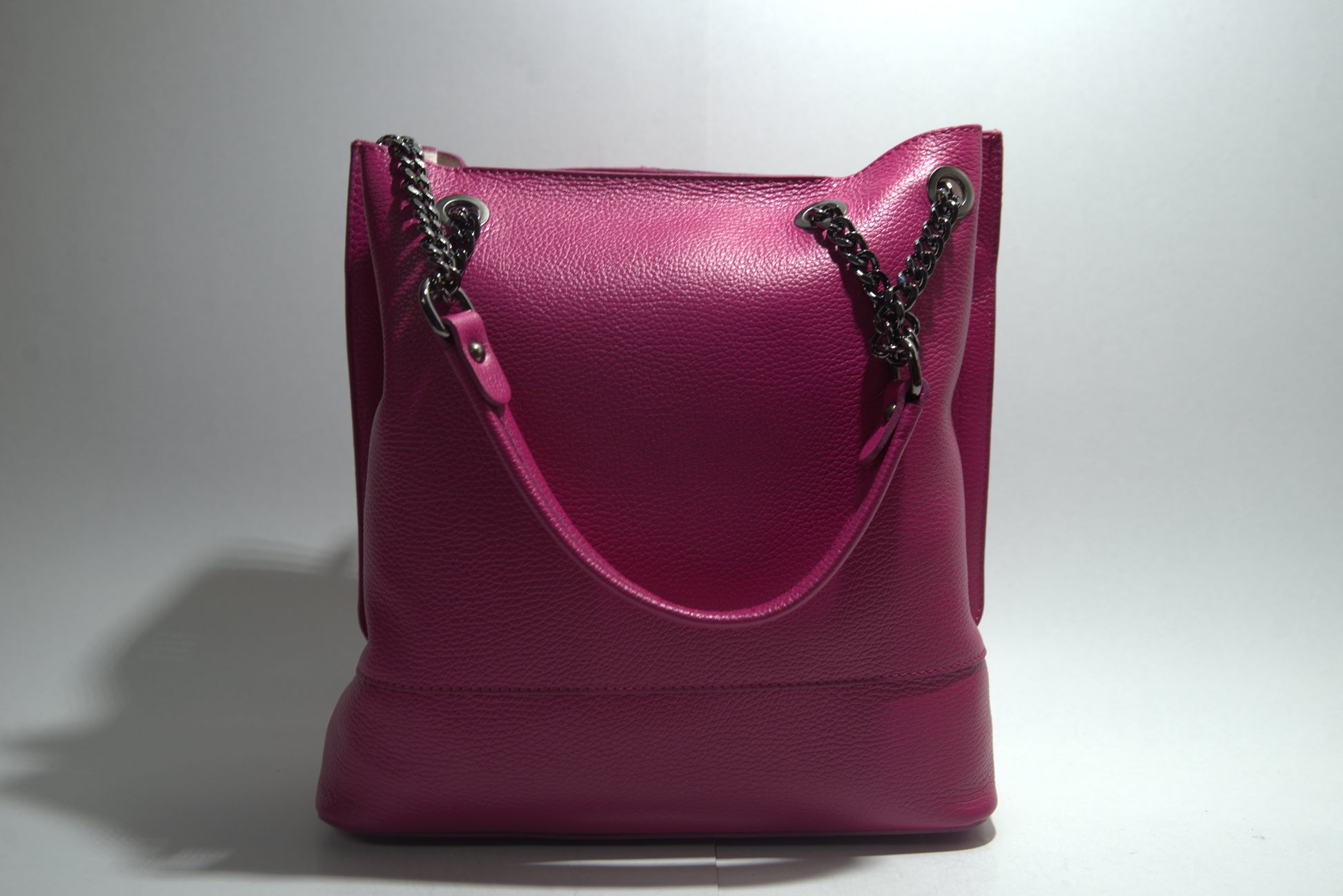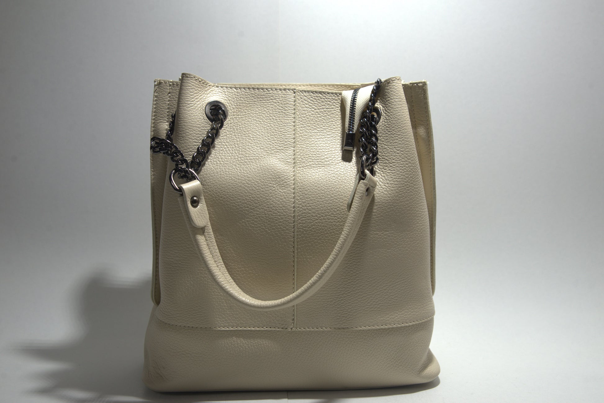 Această poșetă elegantă din piele naturală impresionează prin designul său sofisticat și detaliile atent lucrate. Fabricată din piele de înaltă calitate, poșeta are o textură pebbled care adaugă un plus de rafinament. Dispune de un compartiment principal spațios, perfect pentru a-ți organiza esențialele zilnice. Mânerele sunt atașate cu lanțuri și inele metalice, oferind un aspect modern și funcțional. Poșeta este ideală pentru orice ocazie, fie că este vorba de o zi la birou sau o ieșire în oraș.