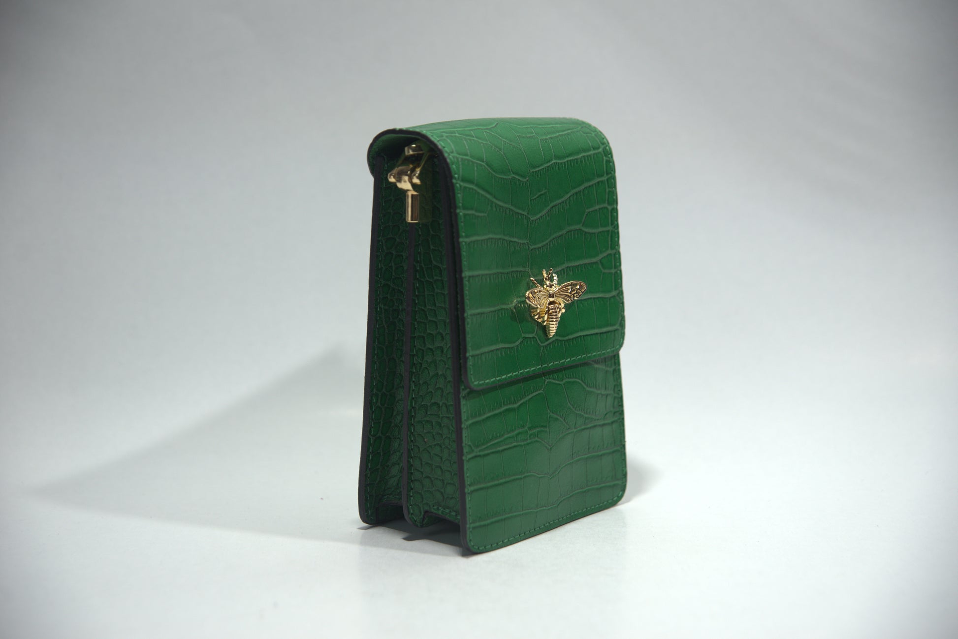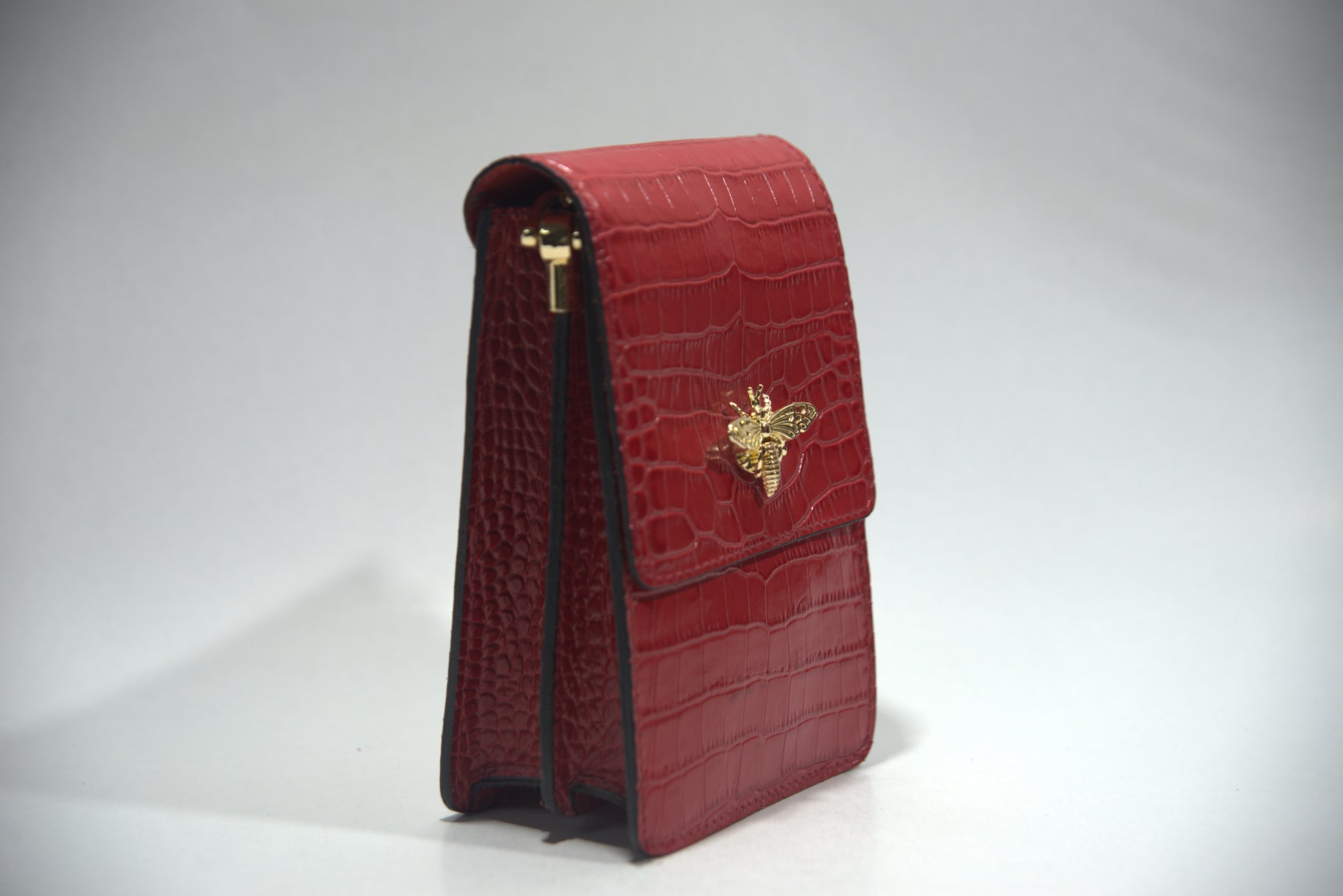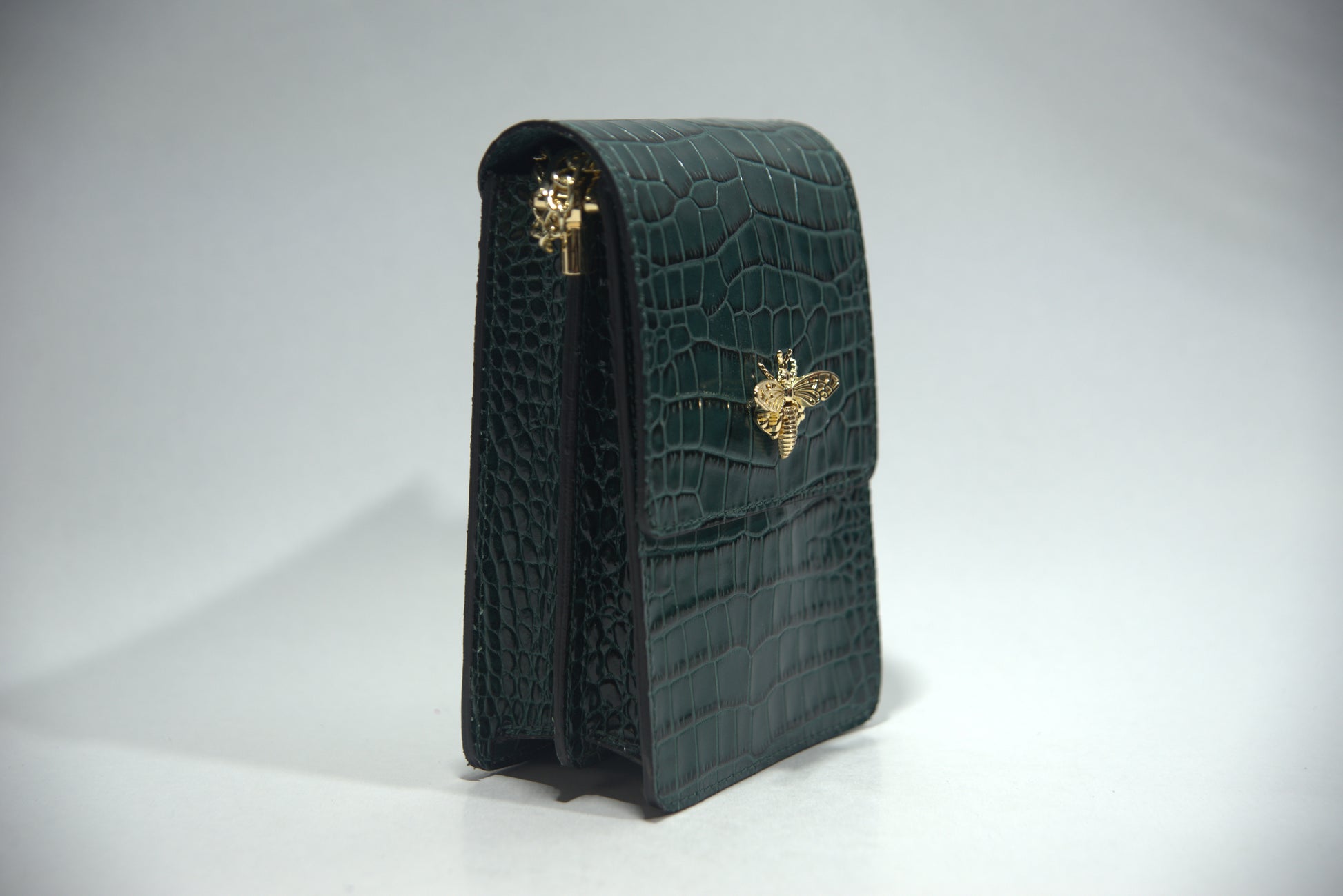 Această poșetă elegantă din piele naturală se remarcă prin textura sa unică, asemănătoare pielii de crocodil. Este accesorizată cu un element metalic auriu în formă de insectă, adăugând un plus de rafinament și originalitate. Poșeta este perfectă pentru a completa orice ținută, oferind atât stil, cât și funcționalitate. Este ideală pentru ocazii speciale sau pentru a adăuga un accent de lux în viața de zi cu zi.