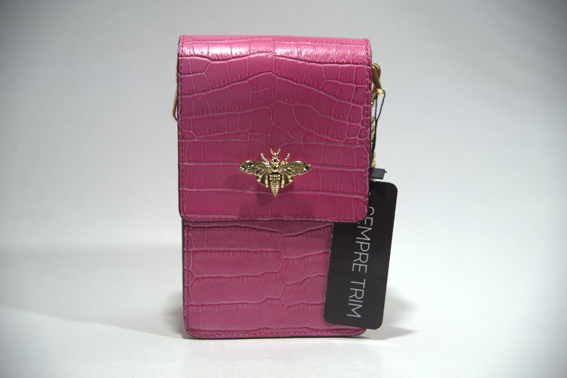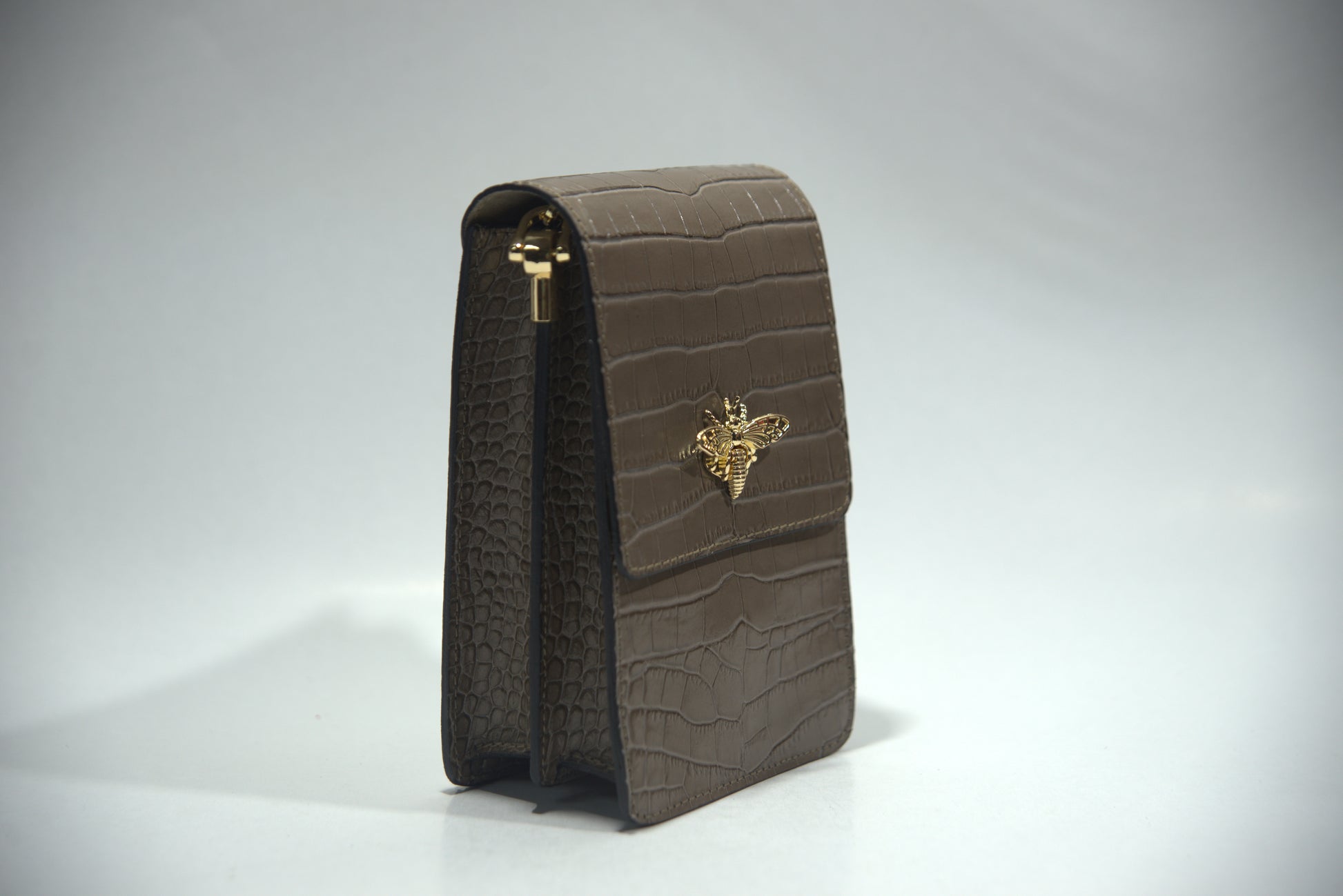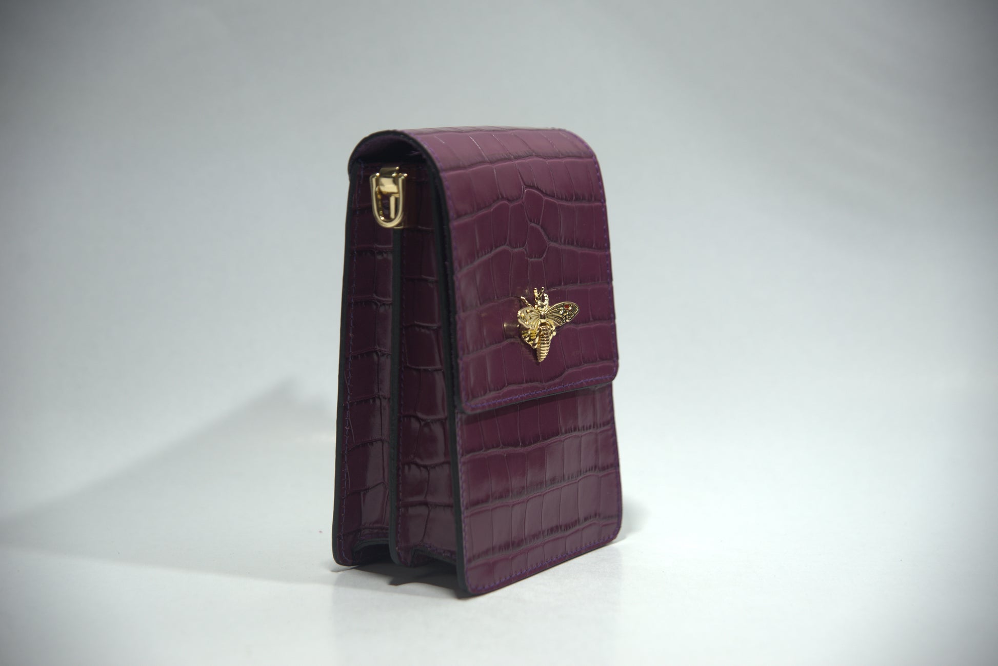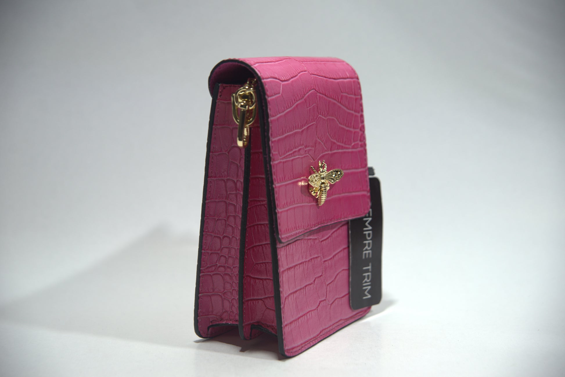 Această poșetă elegantă din piele naturală se remarcă prin textura sa unică, asemănătoare pielii de crocodil. Este accesorizată cu un element metalic auriu în formă de insectă, adăugând un plus de rafinament și originalitate. Poșeta este perfectă pentru a completa orice ținută, oferind atât stil, cât și funcționalitate. Este ideală pentru ocazii speciale sau pentru a adăuga un accent de lux în viața de zi cu zi.