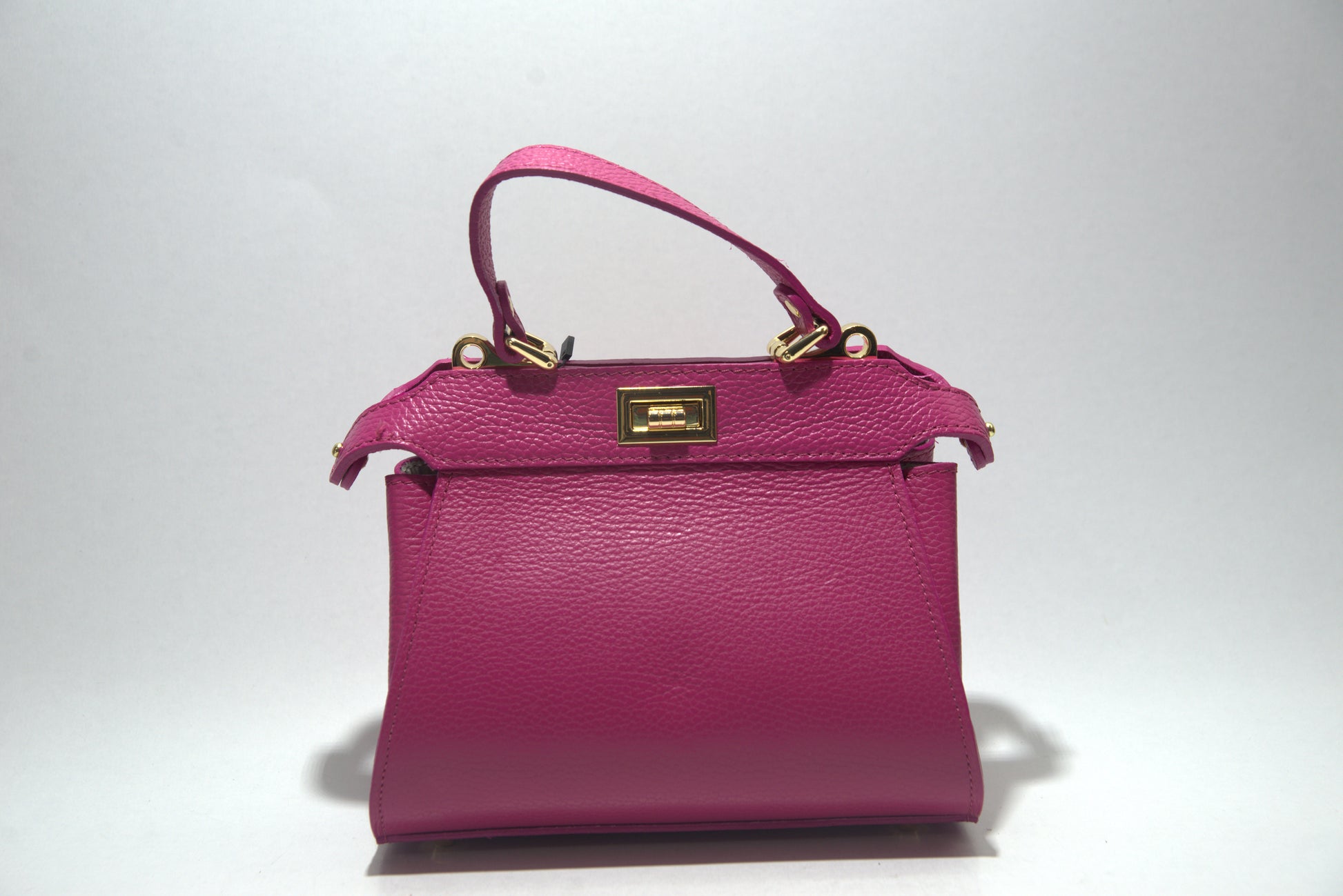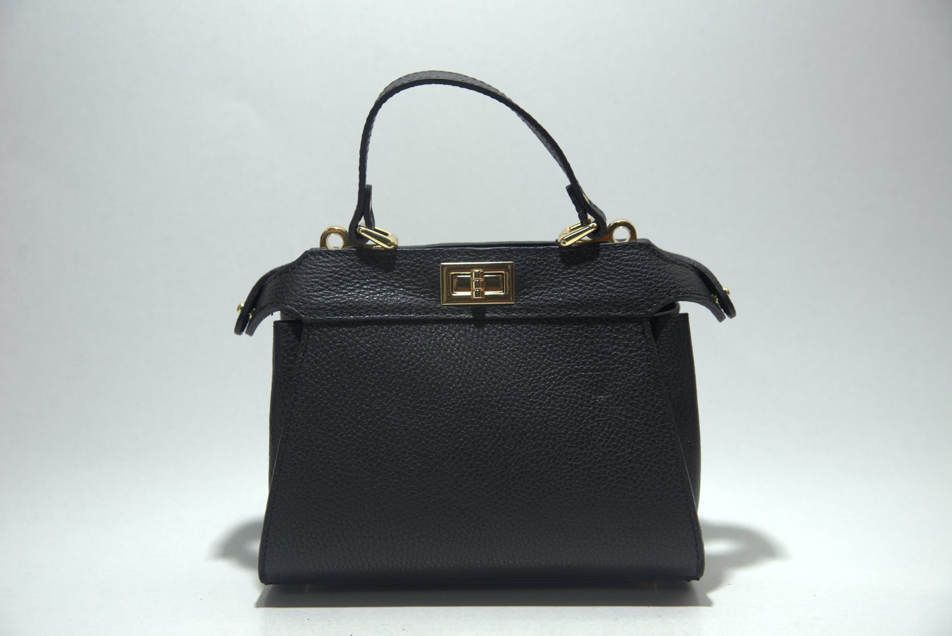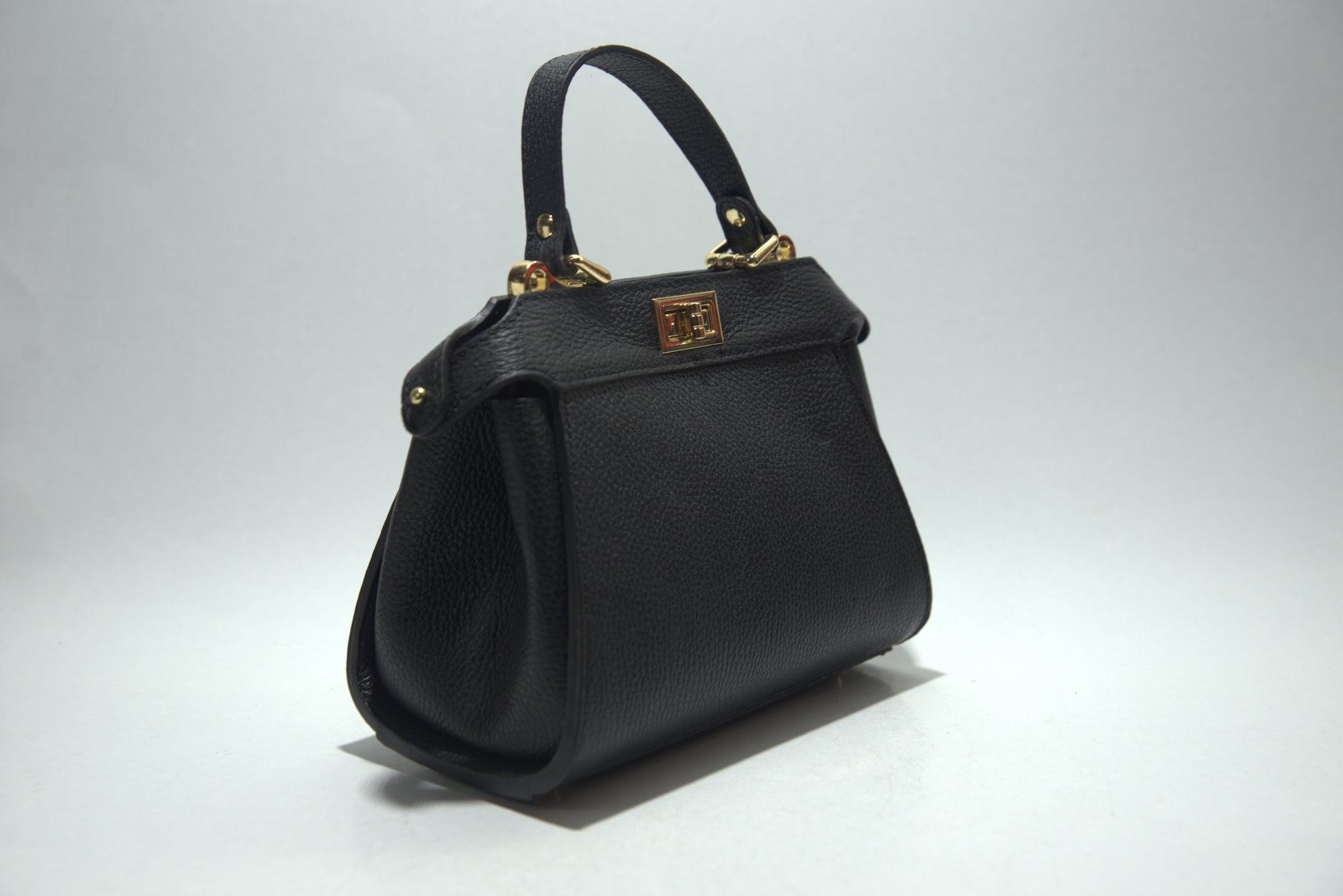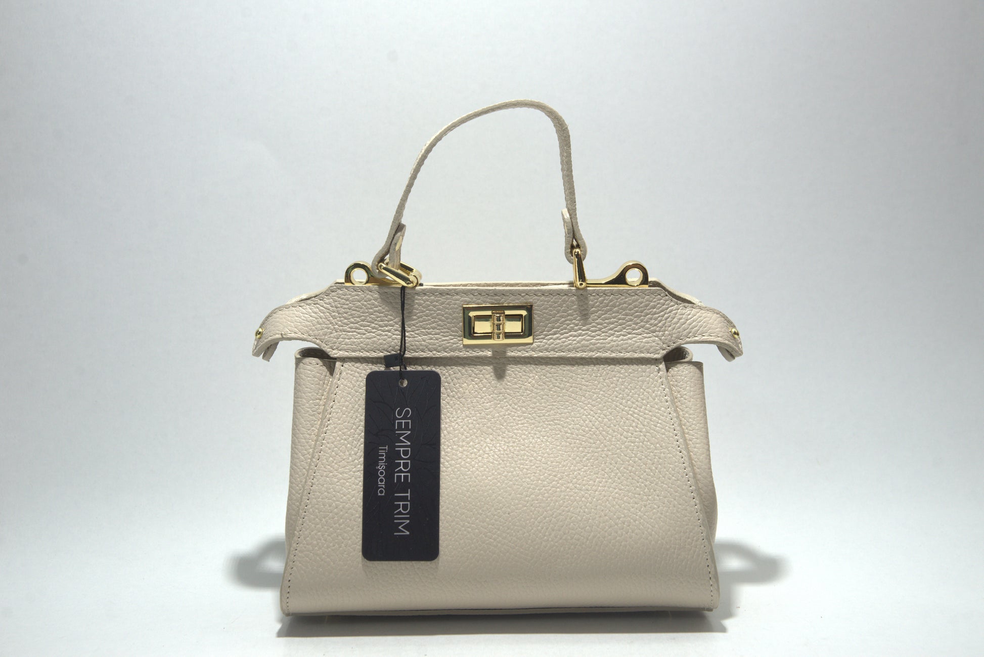 Această poșetă elegantă este confecționată din piele naturală de înaltă calitate, oferind un aspect sofisticat și durabilitate. Designul său structurat include un capac superior cu închidere metalică tip twist-lock, asigurând atât securitate, cât și un stil modern. Poșeta este dotată cu un mâner robust, atașat prin bucle și pini metalici, facilitând transportul confortabil. La baza poșetei se află mici ținte metalice care protejează pielea de uzură atunci când este așezată. Această poșetă combină funcționalitatea cu eleganța, fiind un accesoriu perfect pentru diverse ocazii.