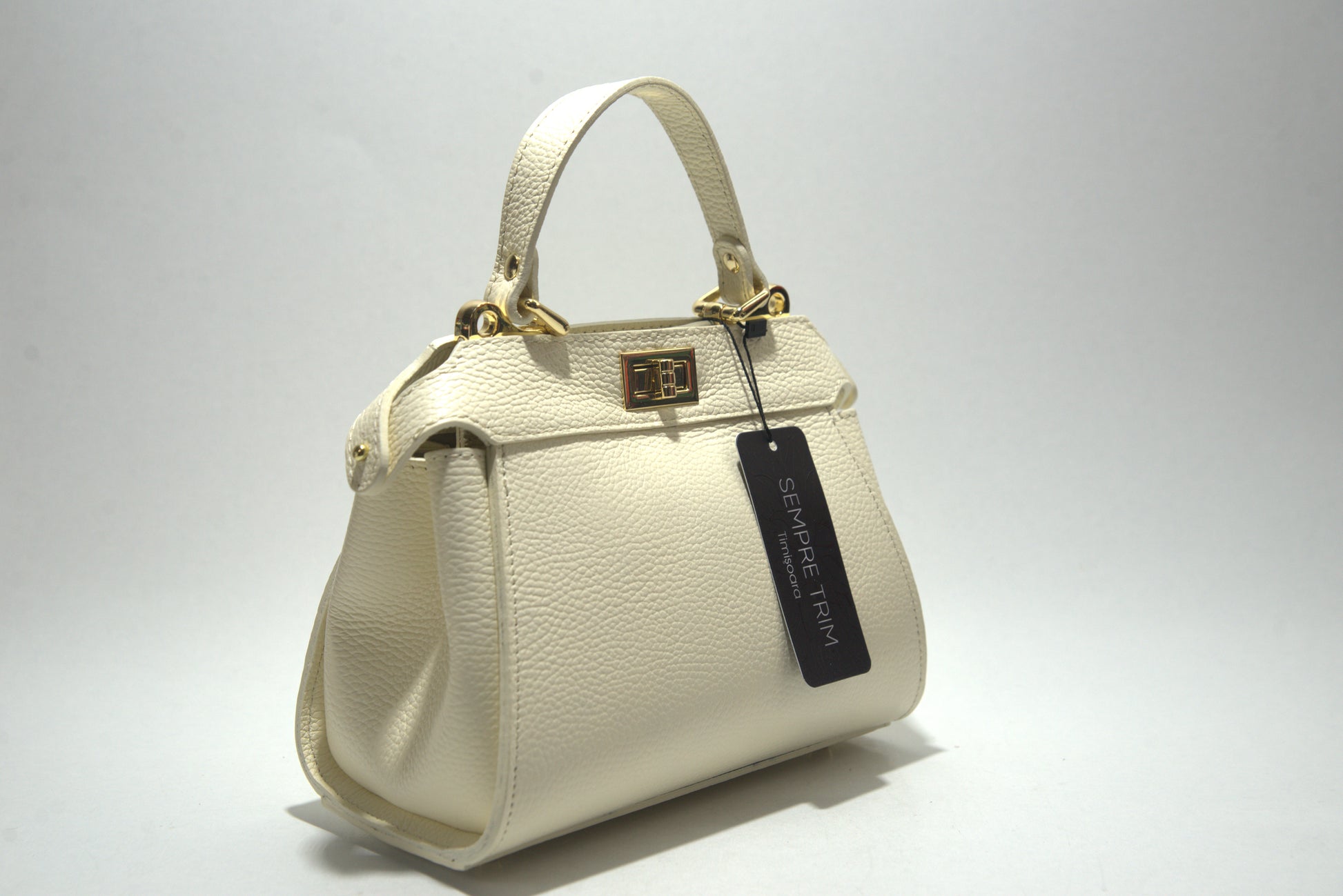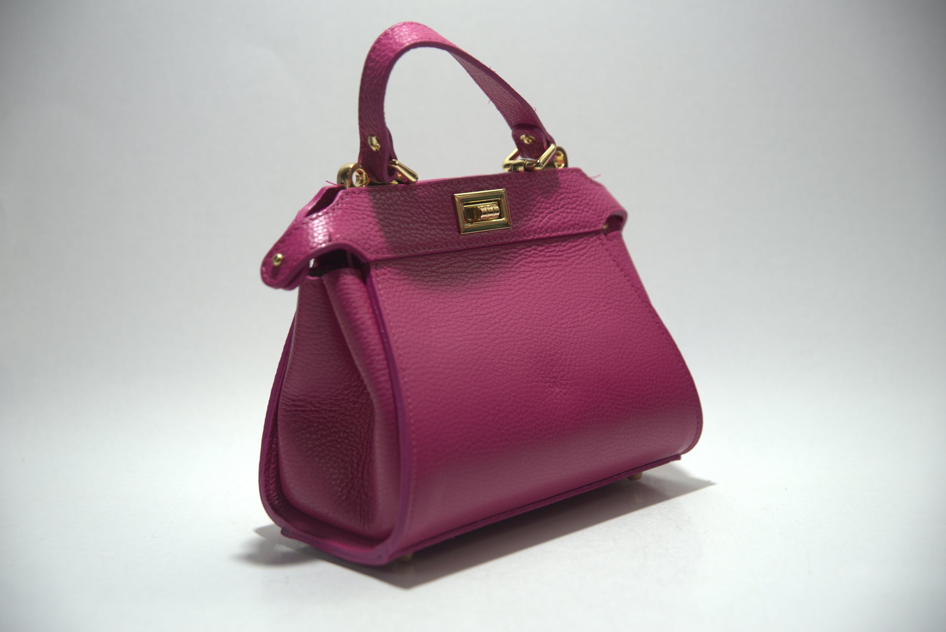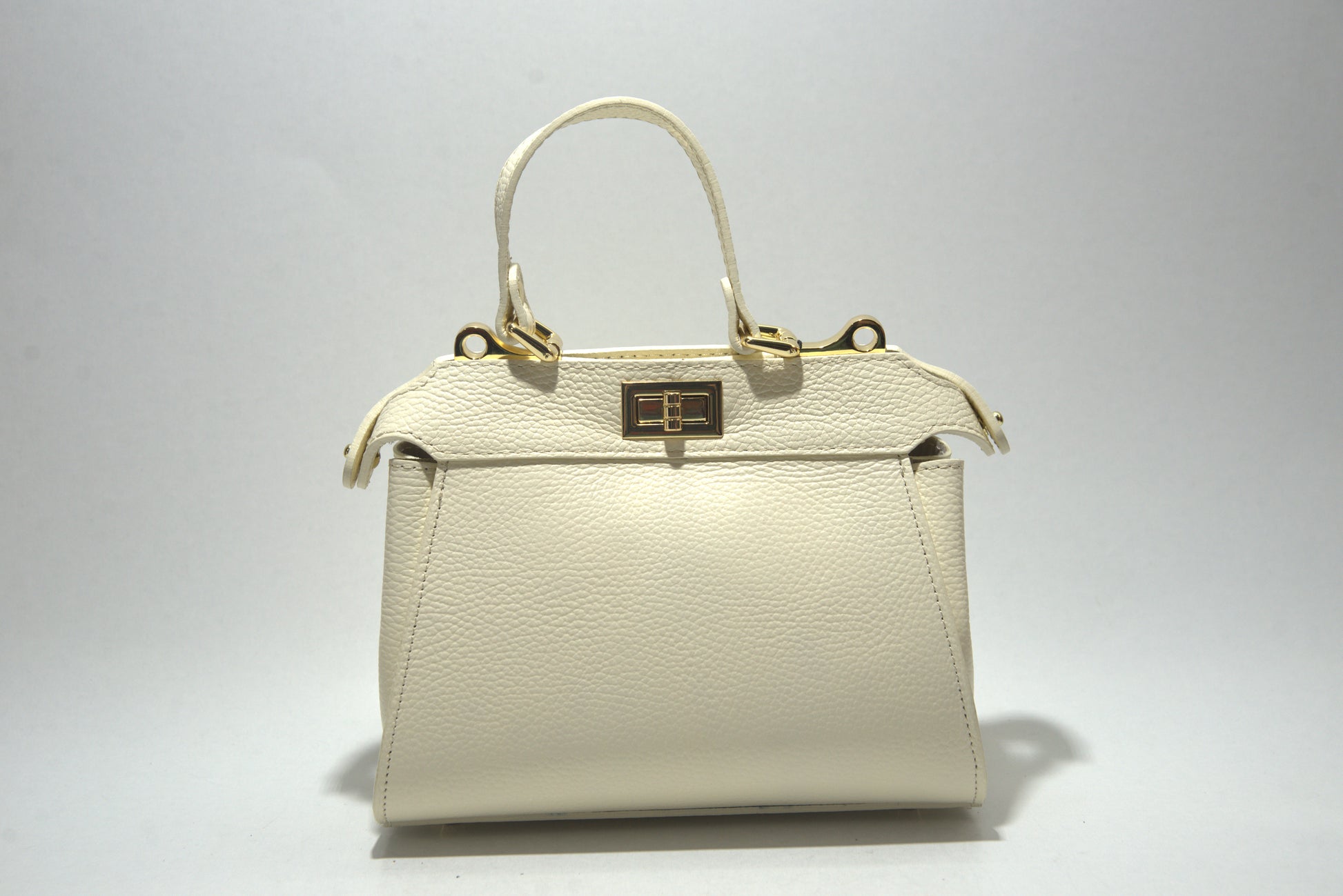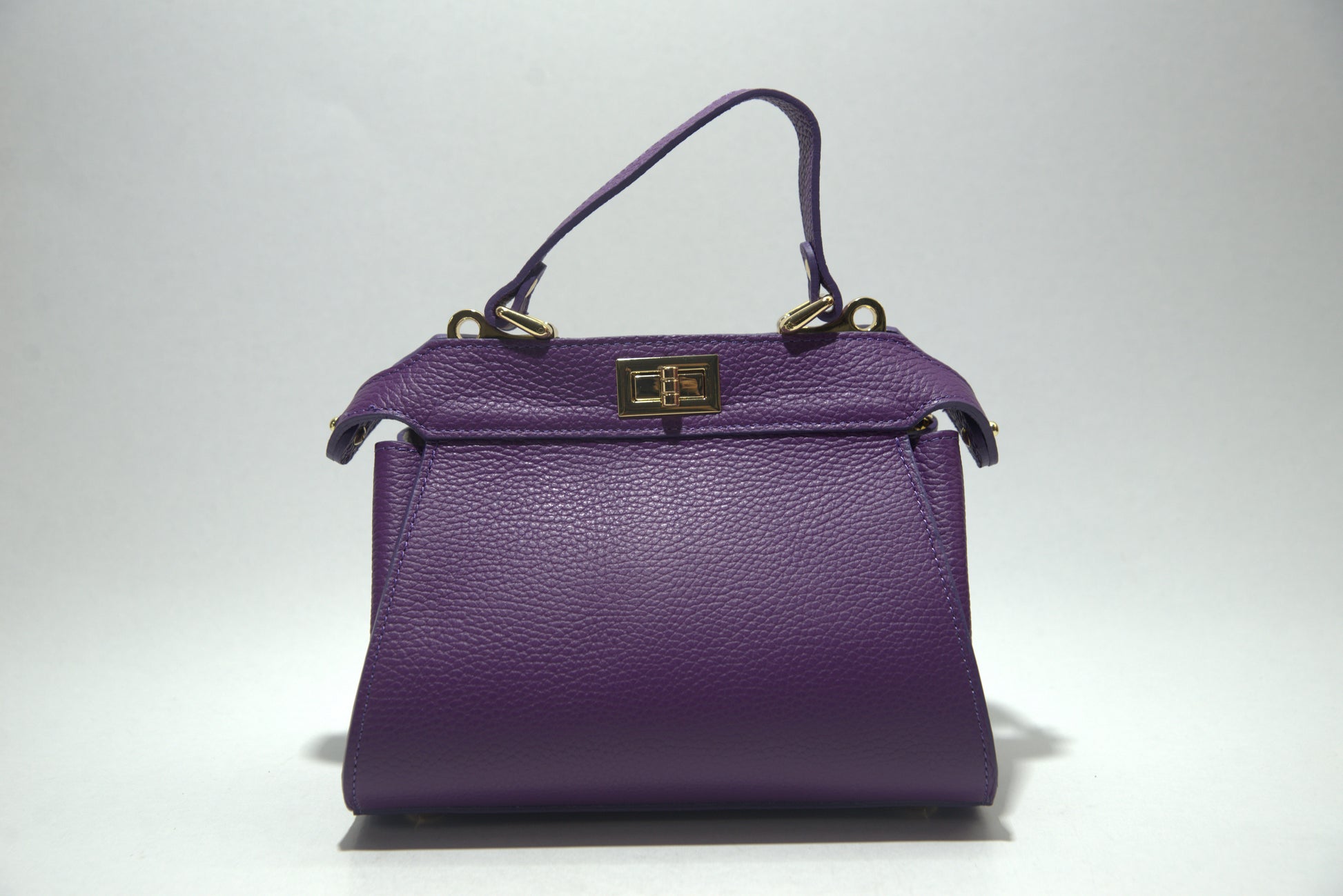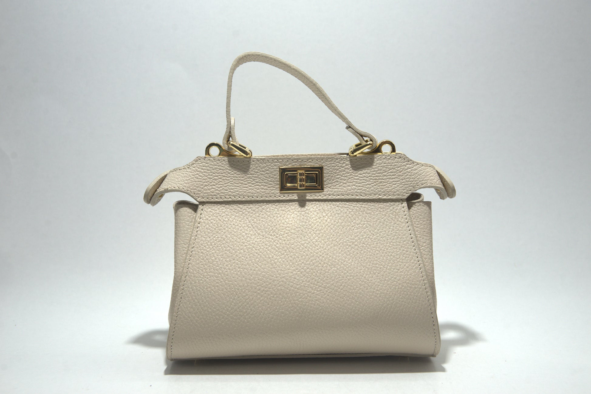 Această poșetă elegantă este confecționată din piele naturală de înaltă calitate, oferind un aspect sofisticat și durabilitate. Designul său structurat include un capac superior cu închidere metalică tip twist-lock, asigurând atât securitate, cât și un stil modern. Poșeta este dotată cu un mâner robust, atașat prin bucle și pini metalici, facilitând transportul confortabil. La baza poșetei se află mici ținte metalice care protejează pielea de uzură atunci când este așezată. Această poșetă combină funcționalitatea cu eleganța, fiind un accesoriu perfect pentru diverse ocazii.