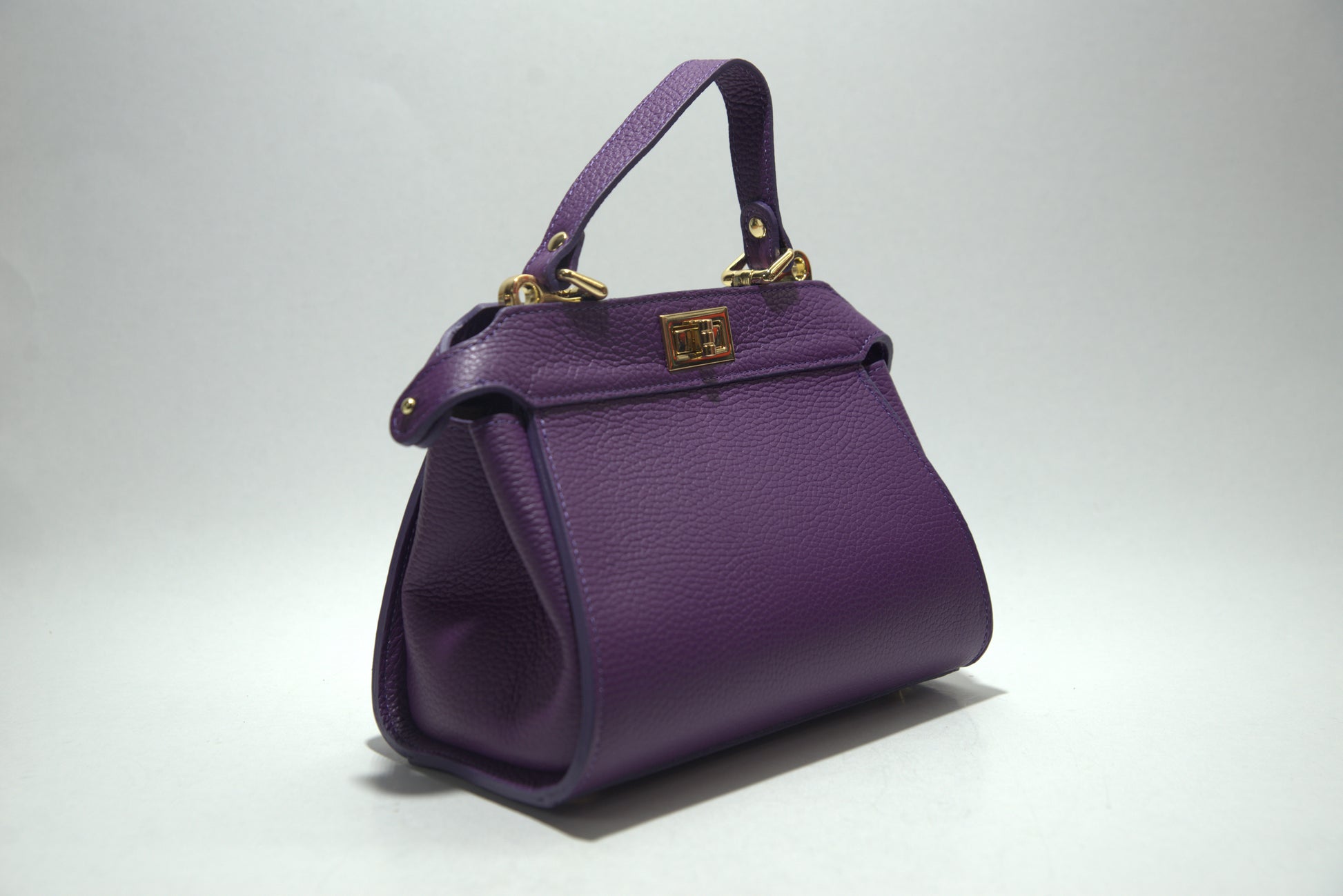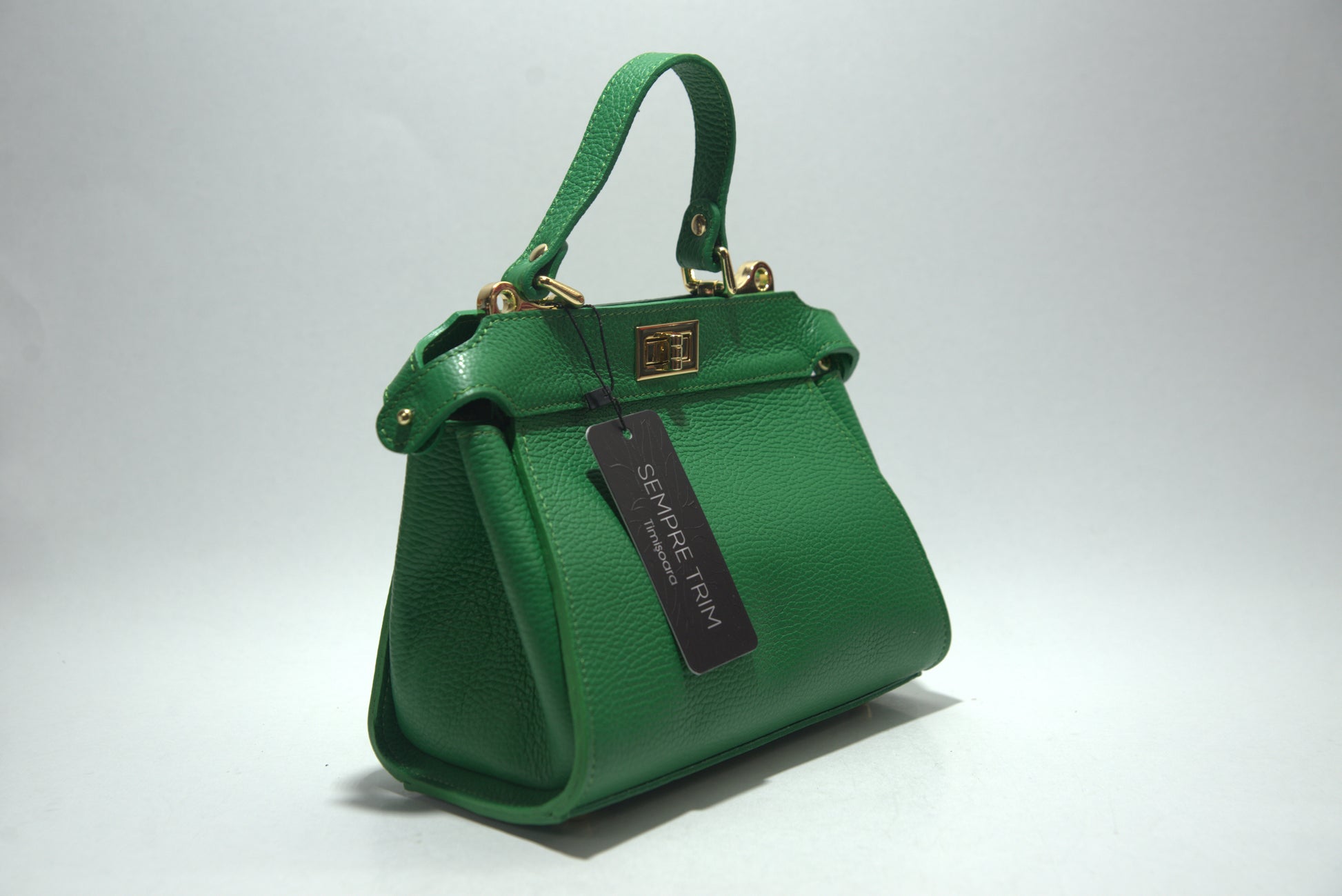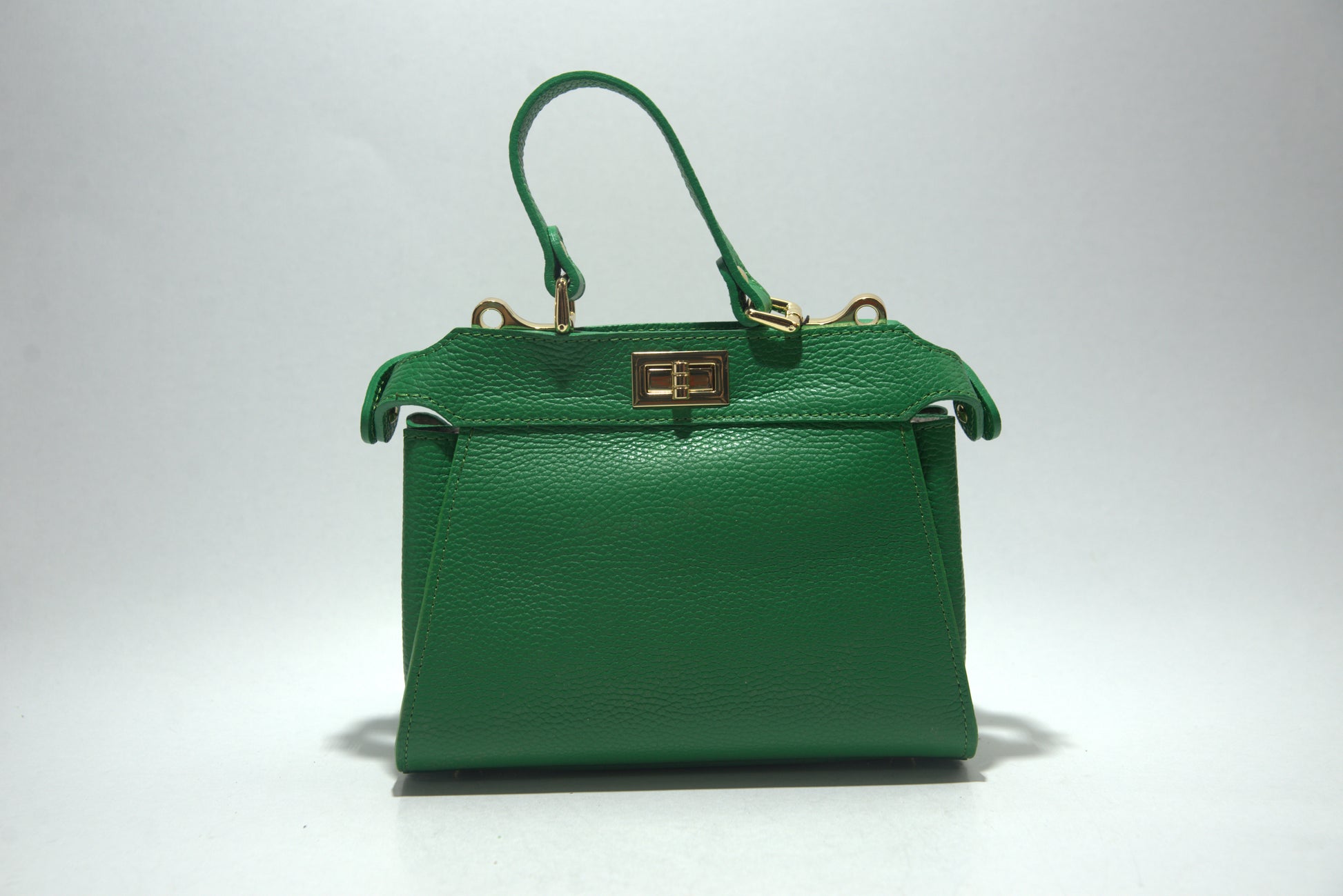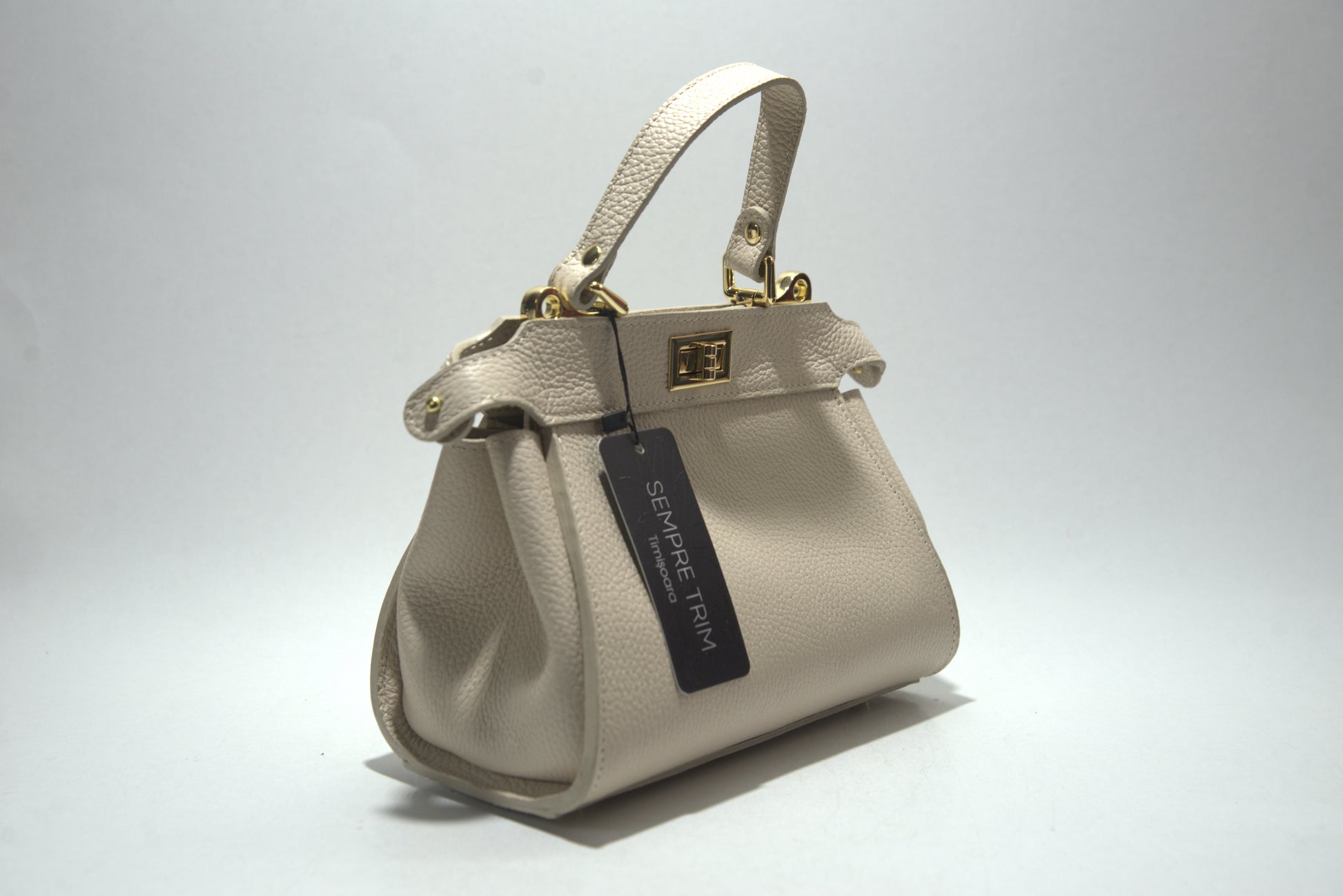 Această poșetă elegantă este confecționată din piele naturală de înaltă calitate, oferind un aspect sofisticat și durabilitate. Designul său structurat include un capac superior cu închidere metalică tip twist-lock, asigurând atât securitate, cât și un stil modern. Poșeta este dotată cu un mâner robust, atașat prin bucle și pini metalici, facilitând transportul confortabil. La baza poșetei se află mici ținte metalice care protejează pielea de uzură atunci când este așezată. Această poșetă combină funcționalitatea cu eleganța, fiind un accesoriu perfect pentru diverse ocazii.