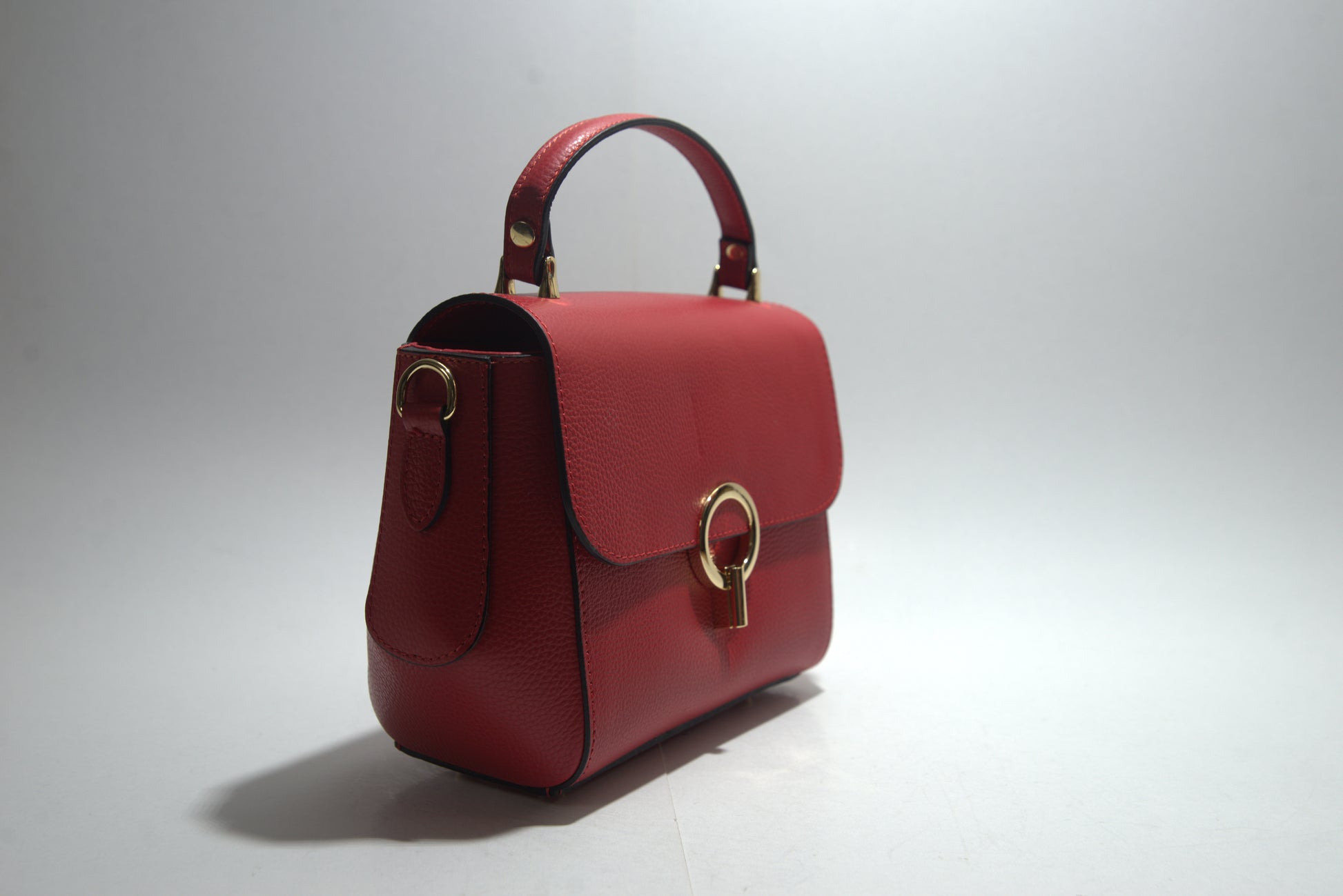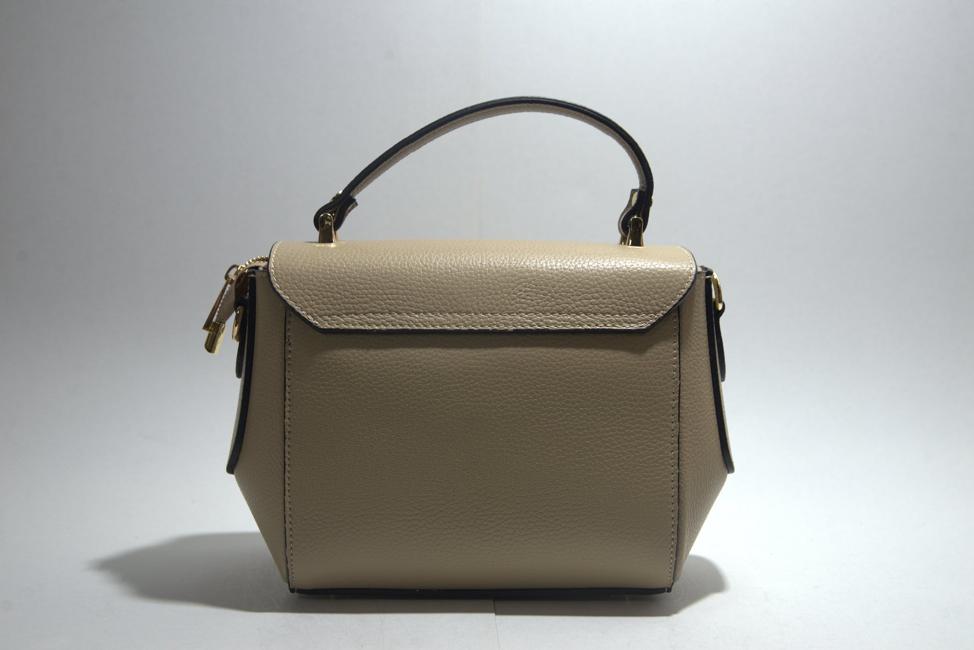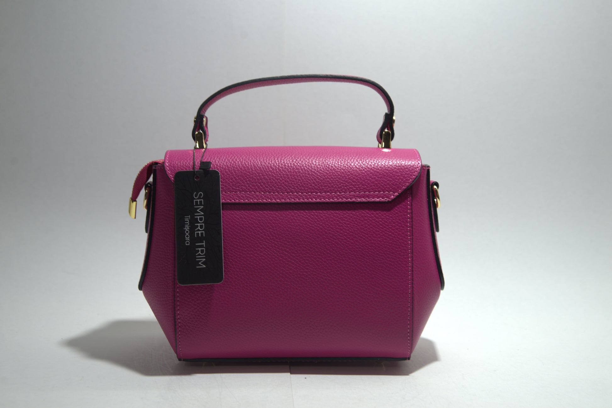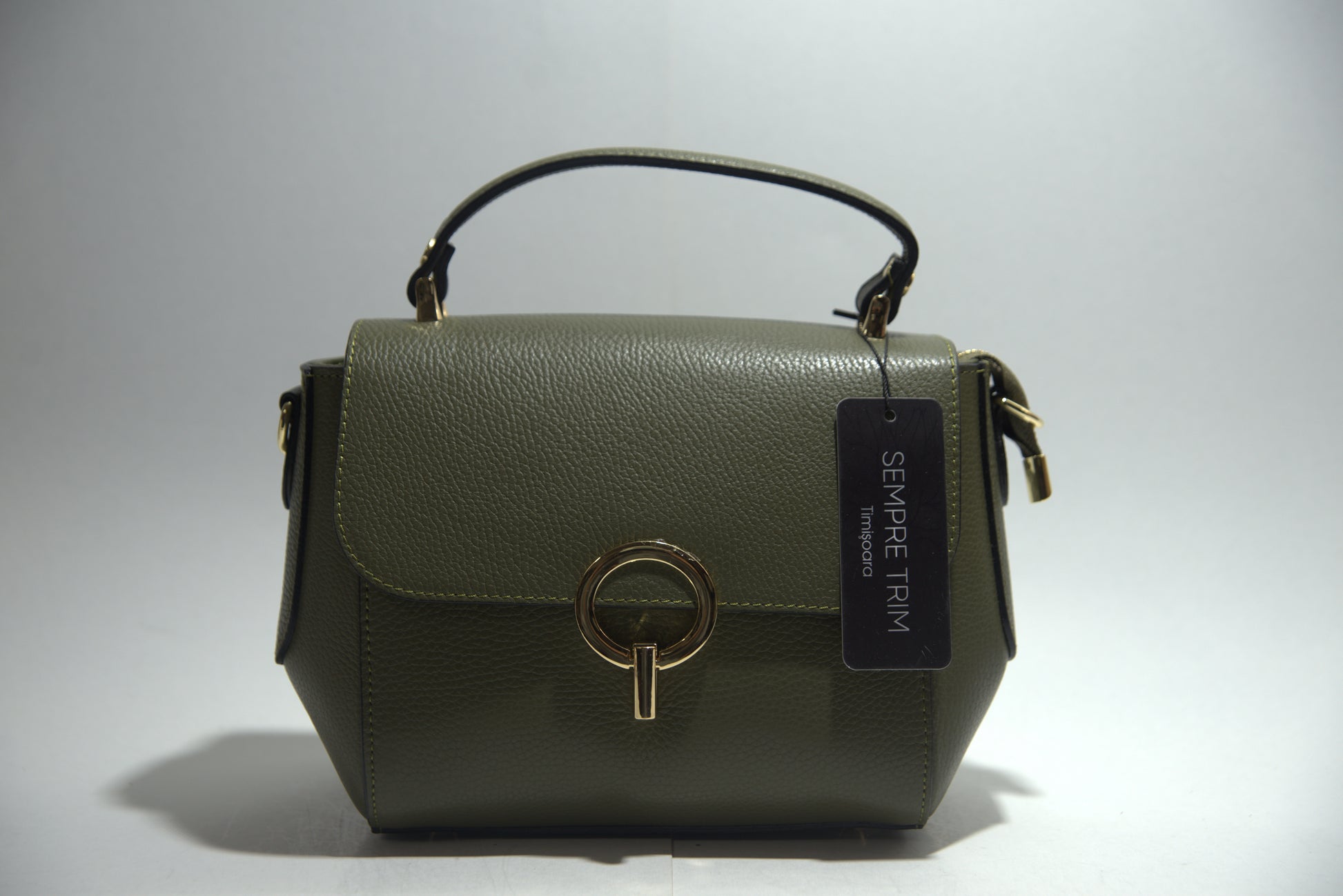 Această geantă de mână prezintă un design clasic și sofisticat, perfect pentru orice ocazie. Realizată dintr-un material sintetic cu aspect de piele granulată, geanta are o formă structurată și linii curate. Accentele metalice aurii, inclusiv închizătoarea circulară distinctivă și fermoarele delicate, adaugă un plus de rafinament. Geanta dispune de un mâner superior solid și o clapetă frontală care se închide pentru securitatea obiectelor personale. Este o piesă atemporală care combină funcționalitatea cu stilul elegant, ideală pentru utilizarea zilnică sau pentru evenimente speciale.