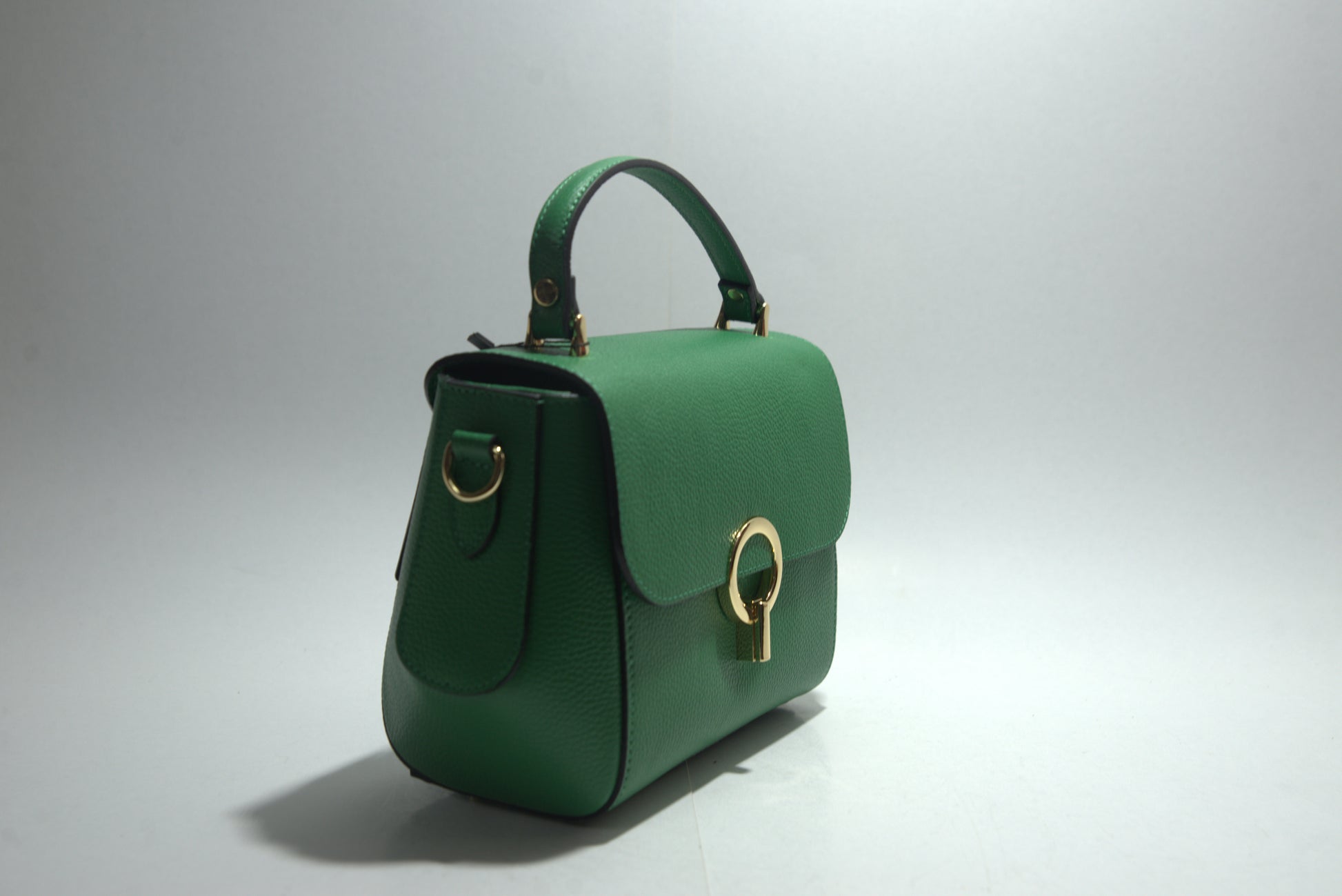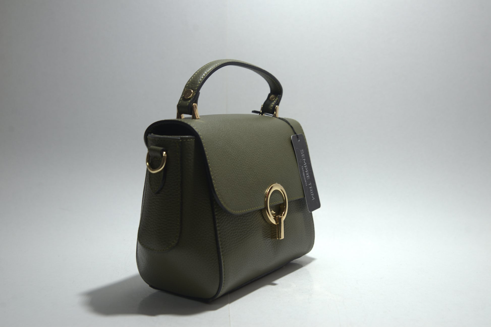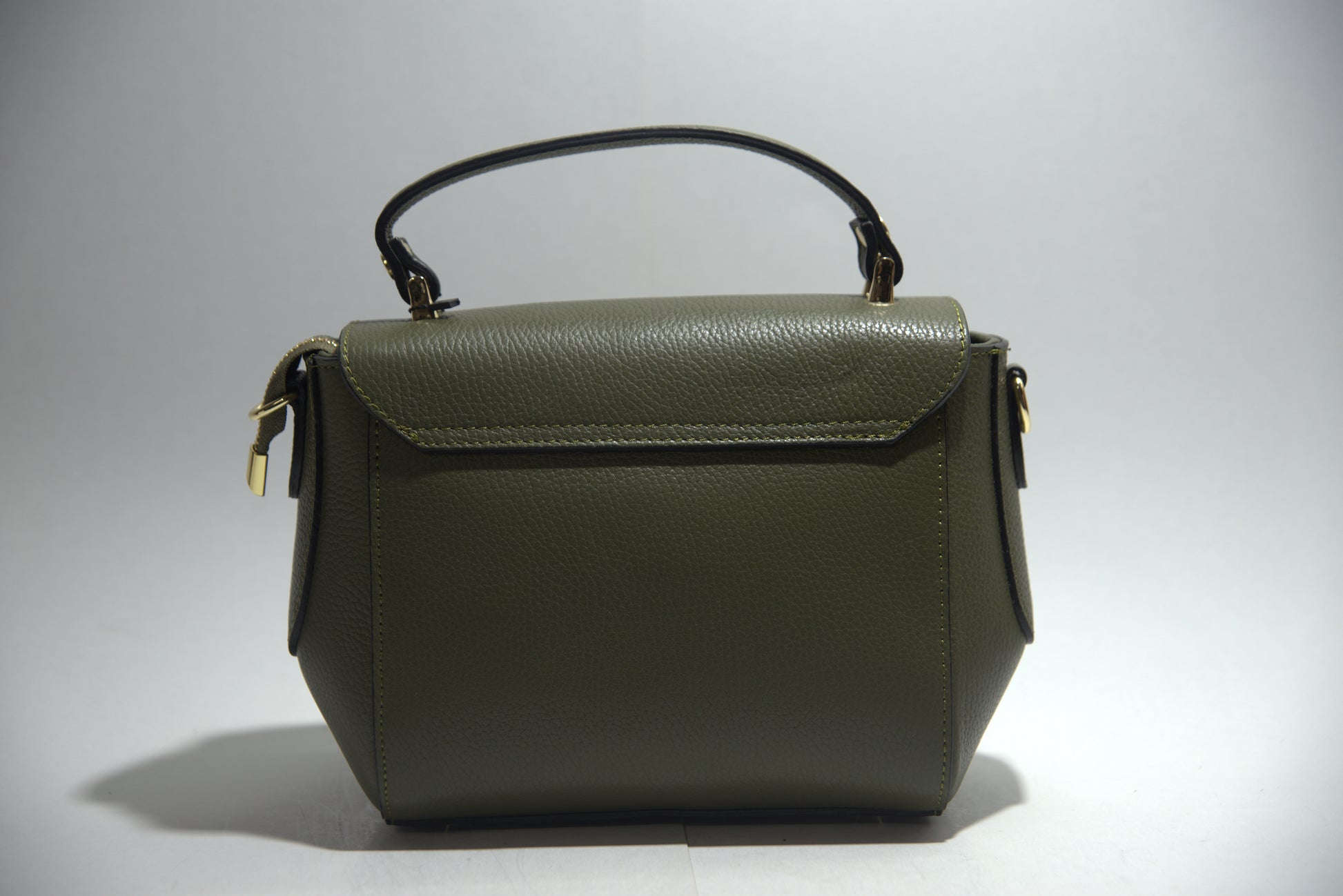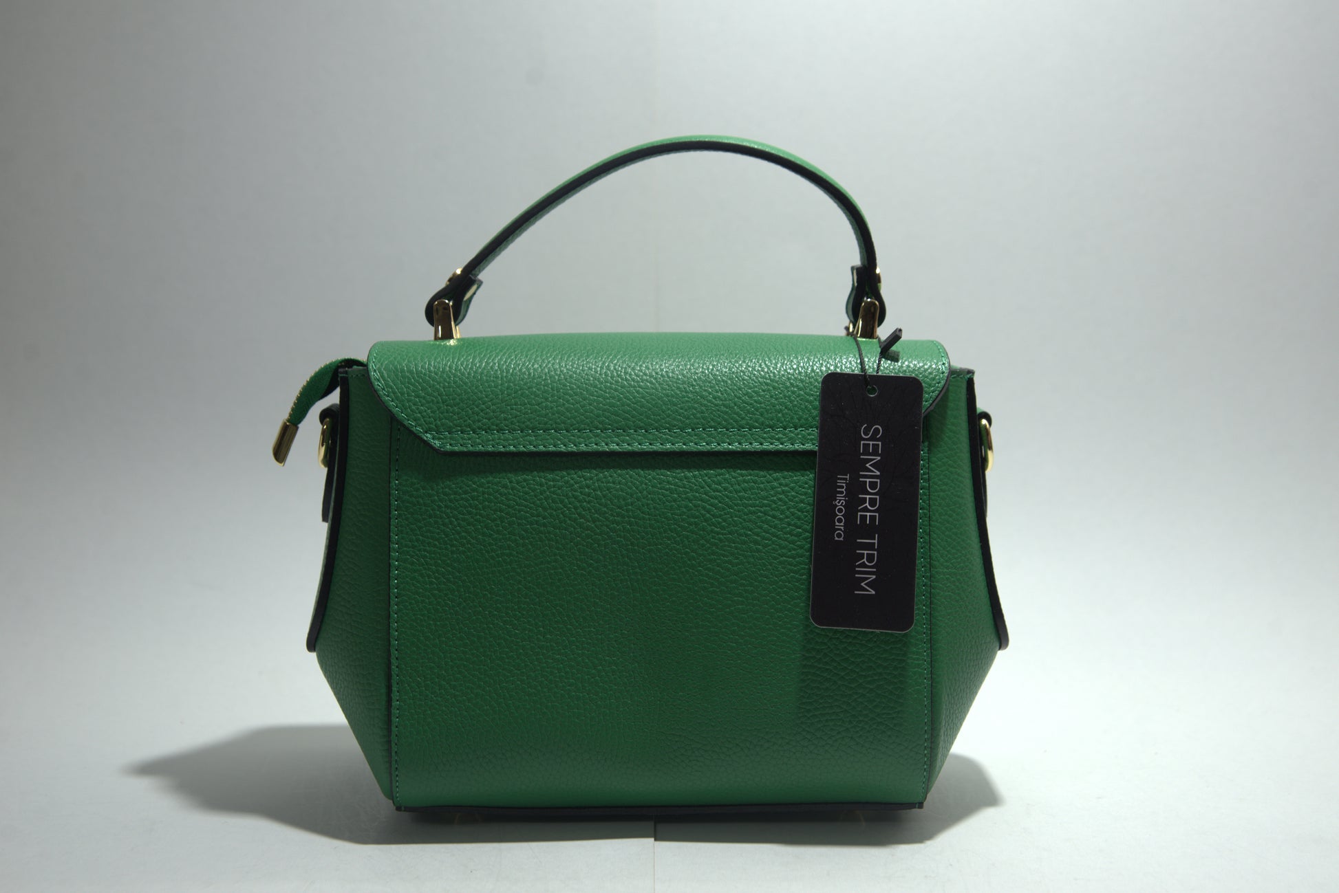 Această geantă de mână prezintă un design clasic și sofisticat, perfect pentru orice ocazie. Realizată dintr-un material sintetic cu aspect de piele granulată, geanta are o formă structurată și linii curate. Accentele metalice aurii, inclusiv închizătoarea circulară distinctivă și fermoarele delicate, adaugă un plus de rafinament. Geanta dispune de un mâner superior solid și o clapetă frontală care se închide pentru securitatea obiectelor personale. Este o piesă atemporală care combină funcționalitatea cu stilul elegant, ideală pentru utilizarea zilnică sau pentru evenimente speciale.