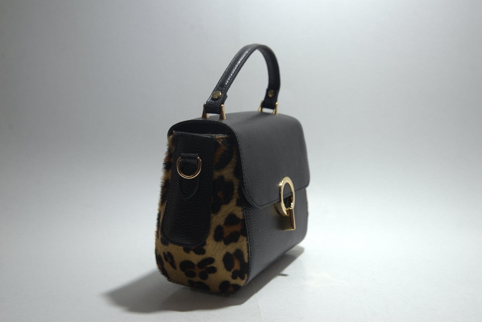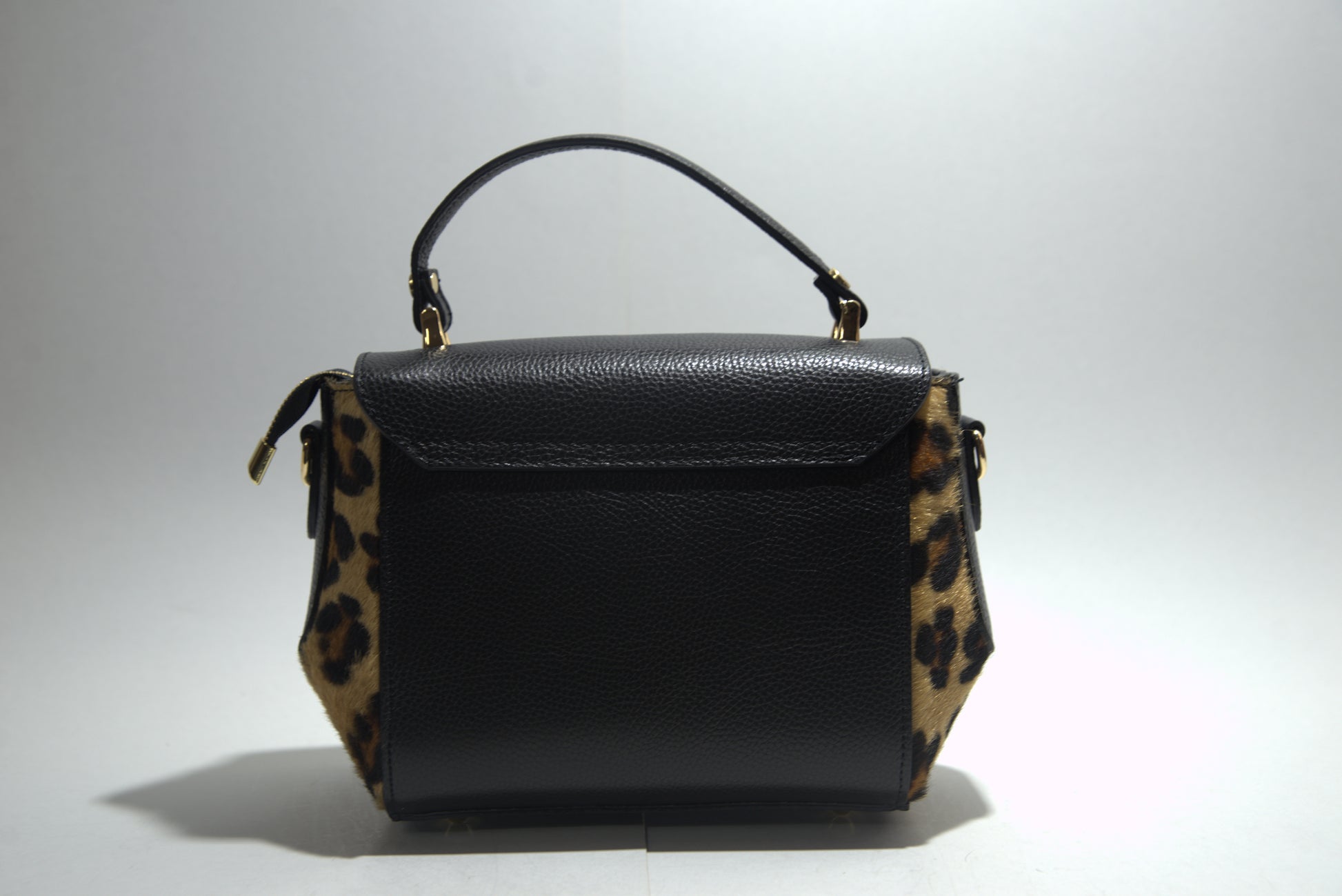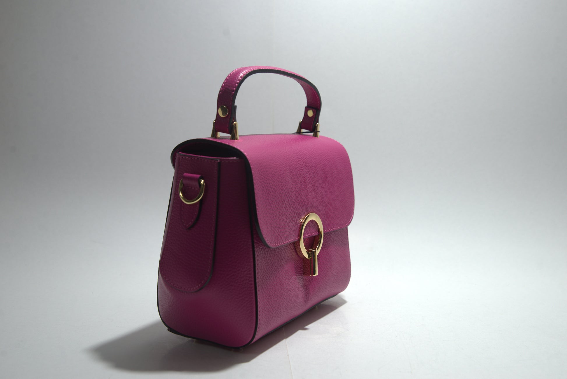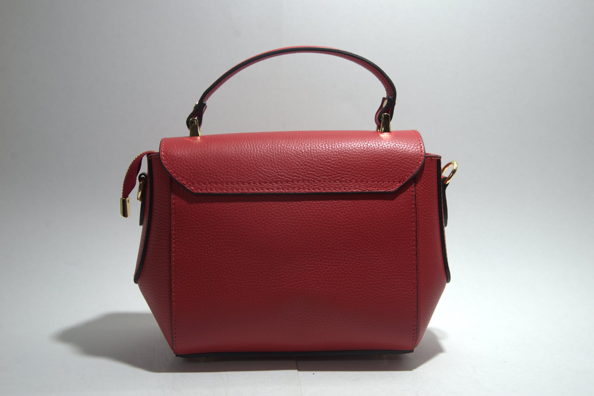 Această geantă de mână prezintă un design clasic și sofisticat, perfect pentru orice ocazie. Realizată dintr-un material sintetic cu aspect de piele granulată, geanta are o formă structurată și linii curate. Accentele metalice aurii, inclusiv închizătoarea circulară distinctivă și fermoarele delicate, adaugă un plus de rafinament. Geanta dispune de un mâner superior solid și o clapetă frontală care se închide pentru securitatea obiectelor personale. Este o piesă atemporală care combină funcționalitatea cu stilul elegant, ideală pentru utilizarea zilnică sau pentru evenimente speciale.