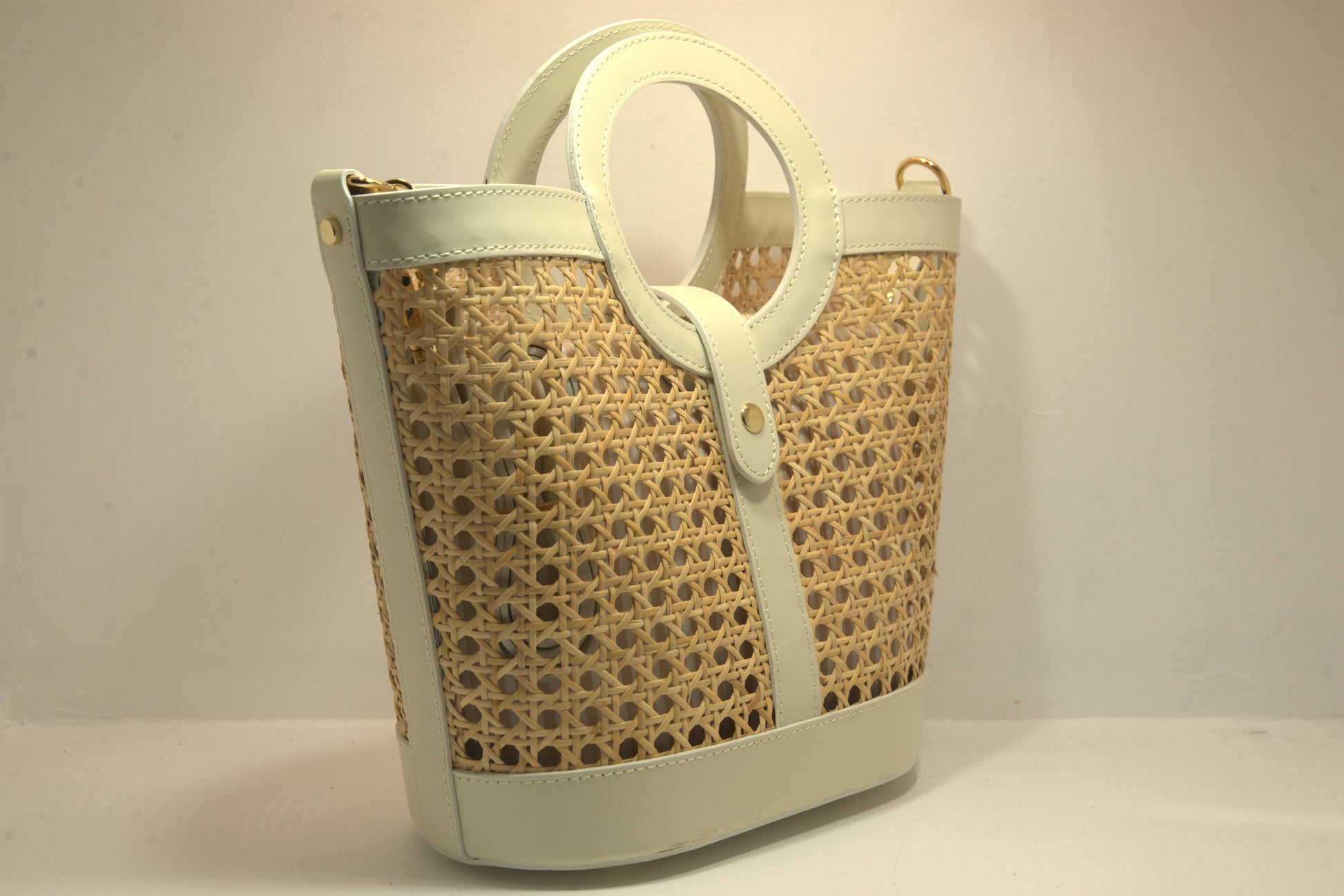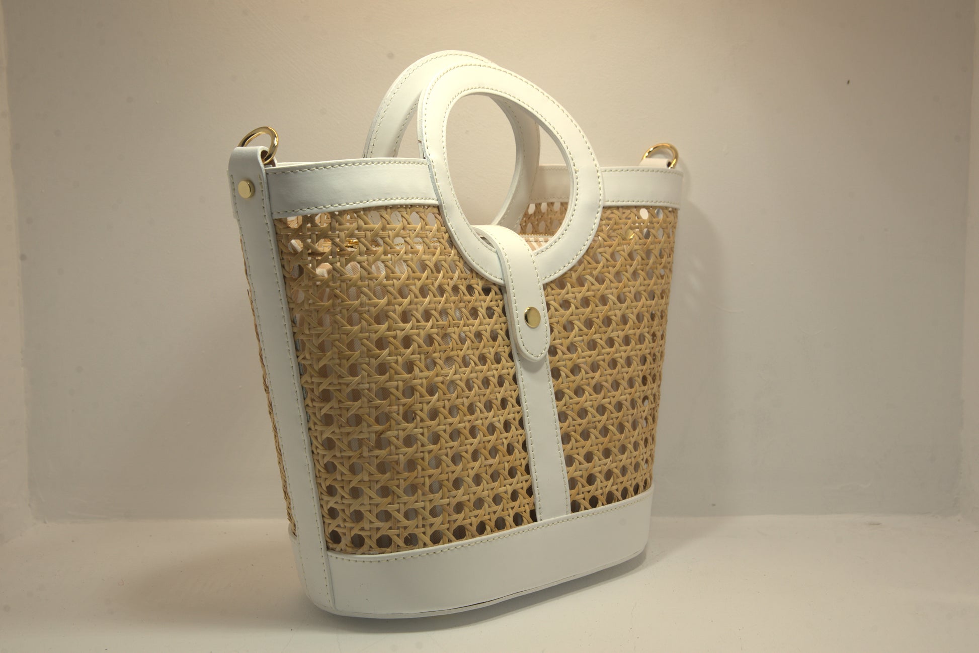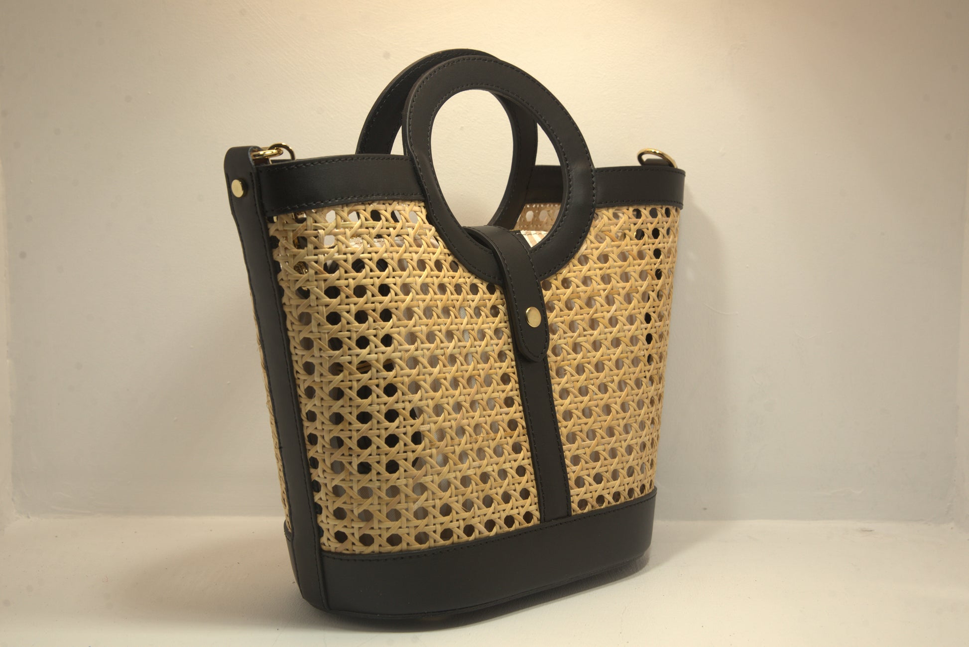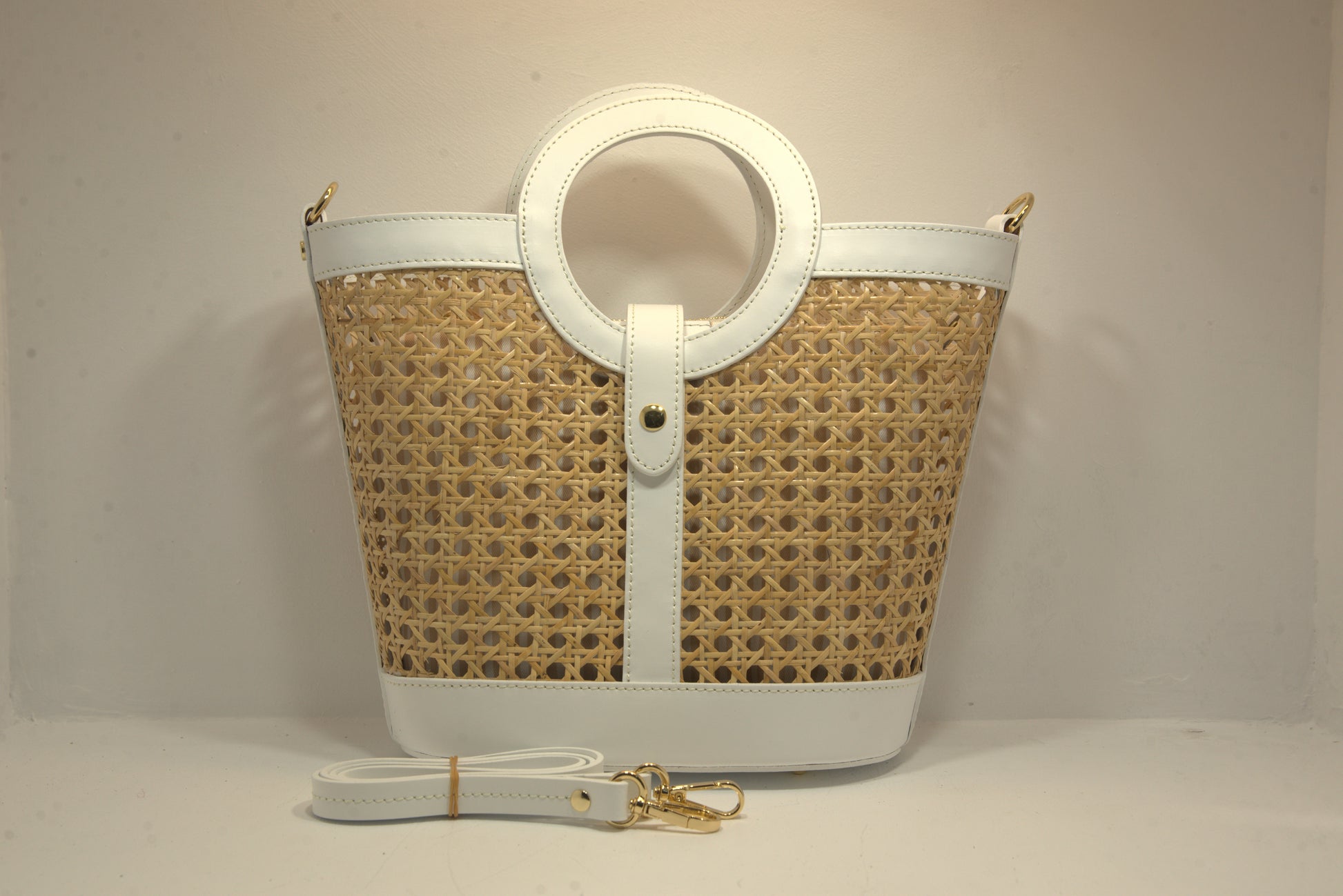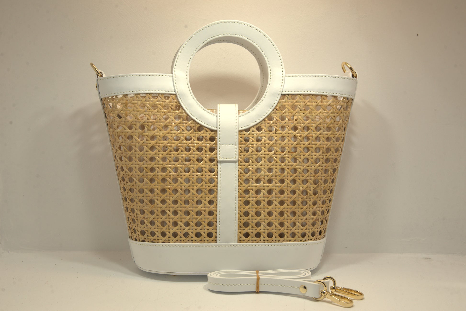 Această geantă de damă combină armonios rafia împletită manual cu pielea naturală, oferind un design contemporan și o notă artizanală. Mânerele rotunde, îmbrăcate complet în piele, adaugă un element distinctiv și elegant, ideal pentru un look casual sofisticat.