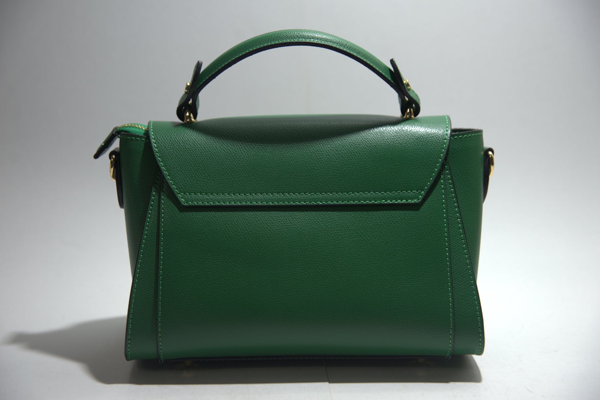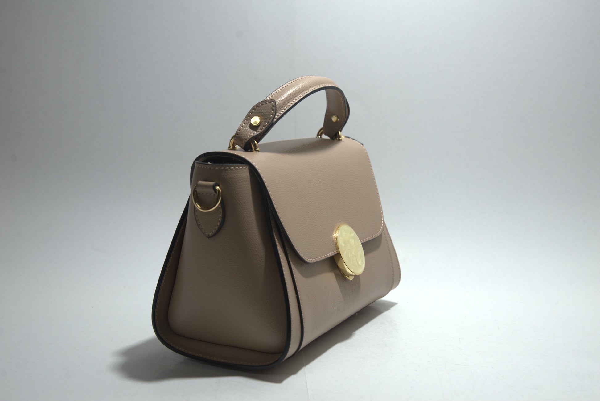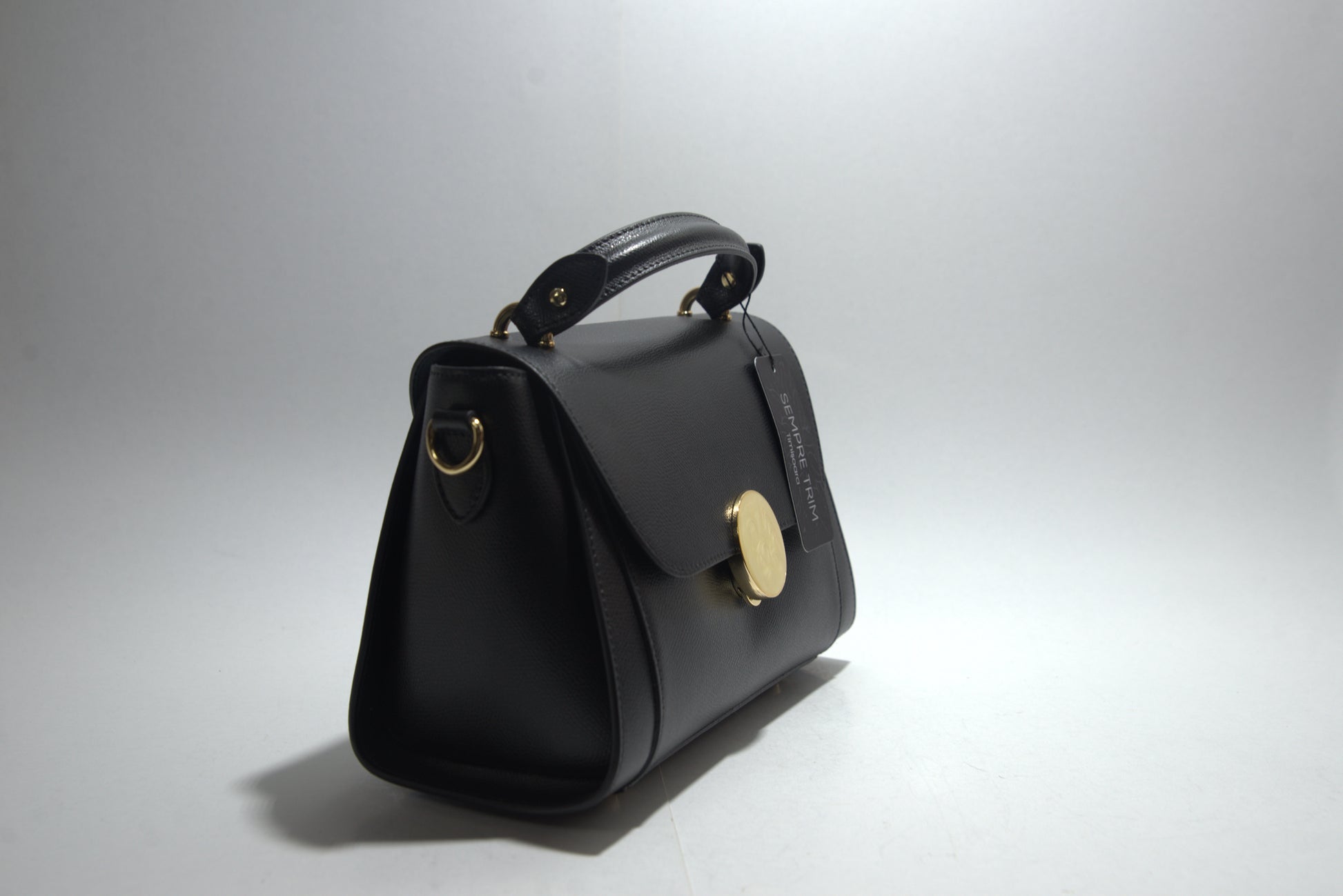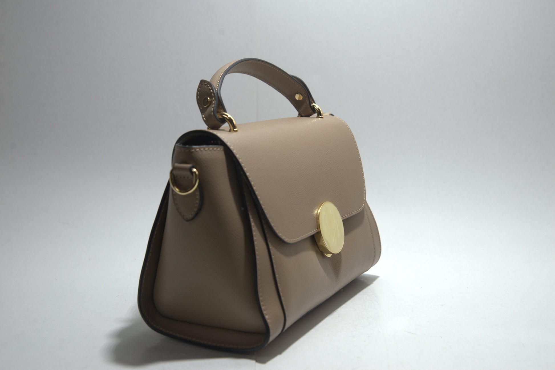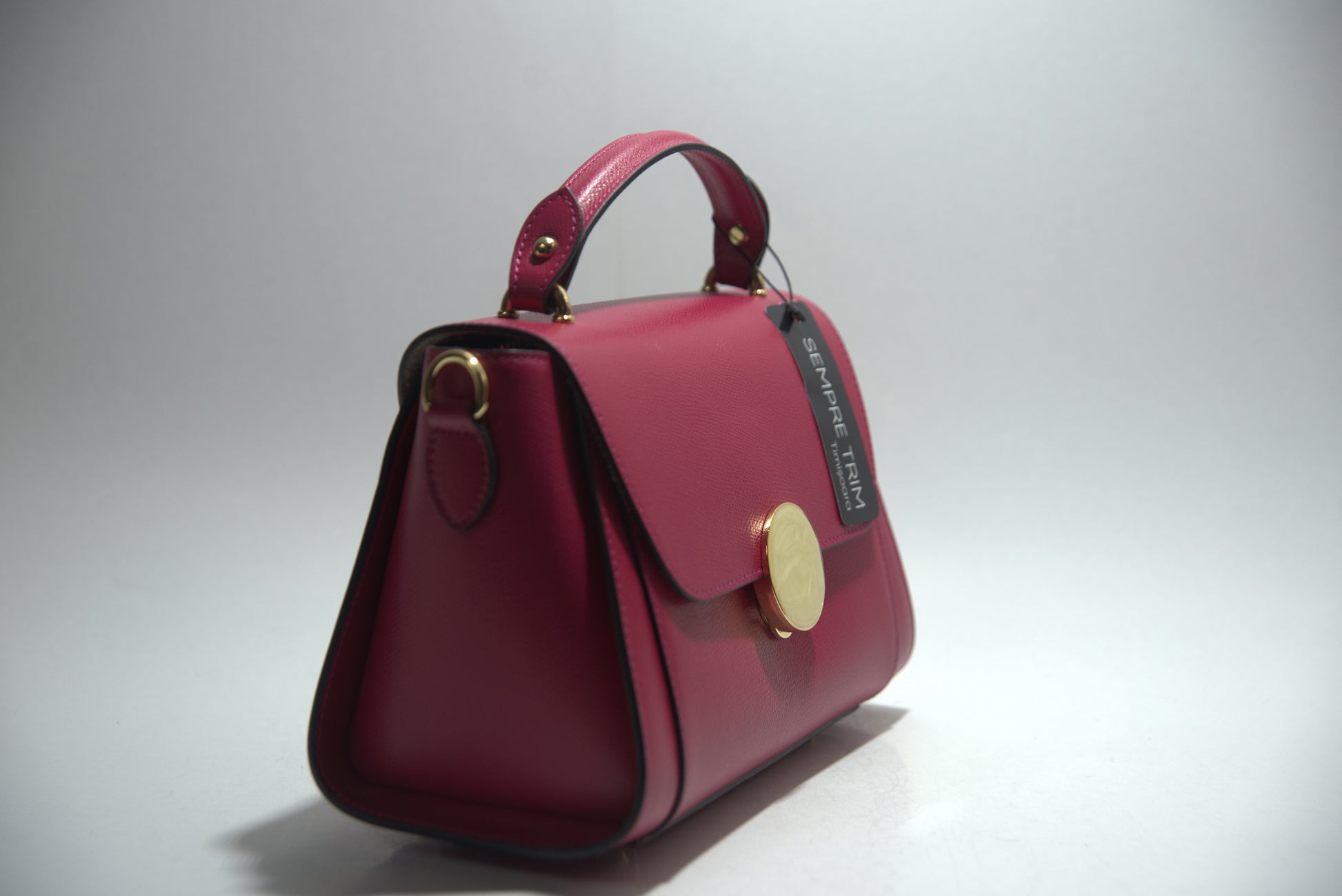 Această poșetă elegantă și structurată este perfectă pentru orice ocazie. Designul său sofisticat include o clapetă frontală cu închidere rotundă, metalică, de culoare aurie, care adaugă un plus de rafinament. Poșeta este prevăzută cu un mâner robust, atașat cu elemente metalice aurii, oferind atât stil, cât și funcționalitate. De asemenea, dispune de atașamente laterale pentru o curea de umăr, oferind versatilitate în purtare. Exteriorul texturat adaugă un aspect modern și distinctiv, făcând această poșetă un accesoriu de nelipsit din garderoba oricărei femei.