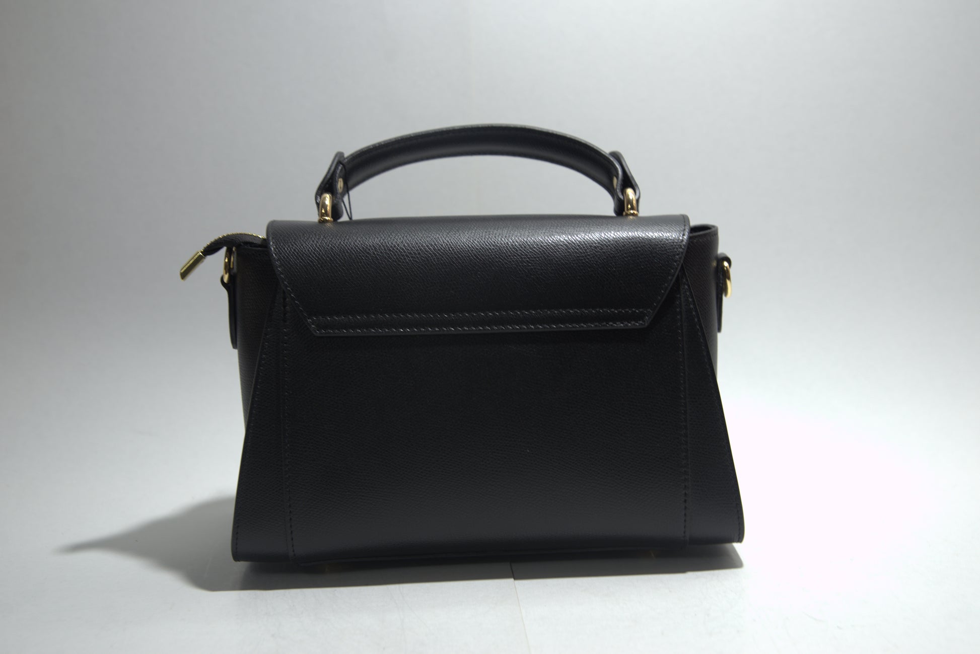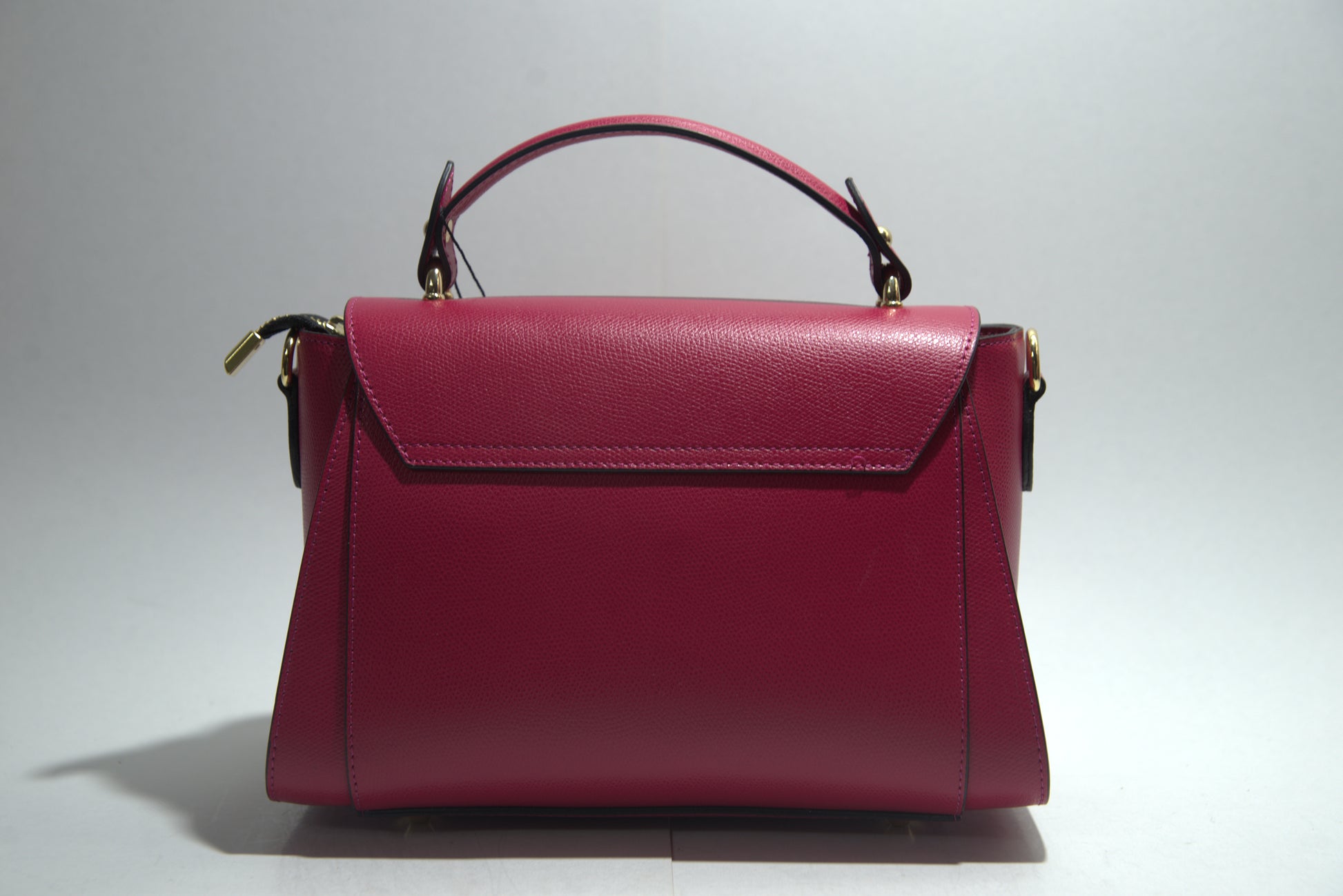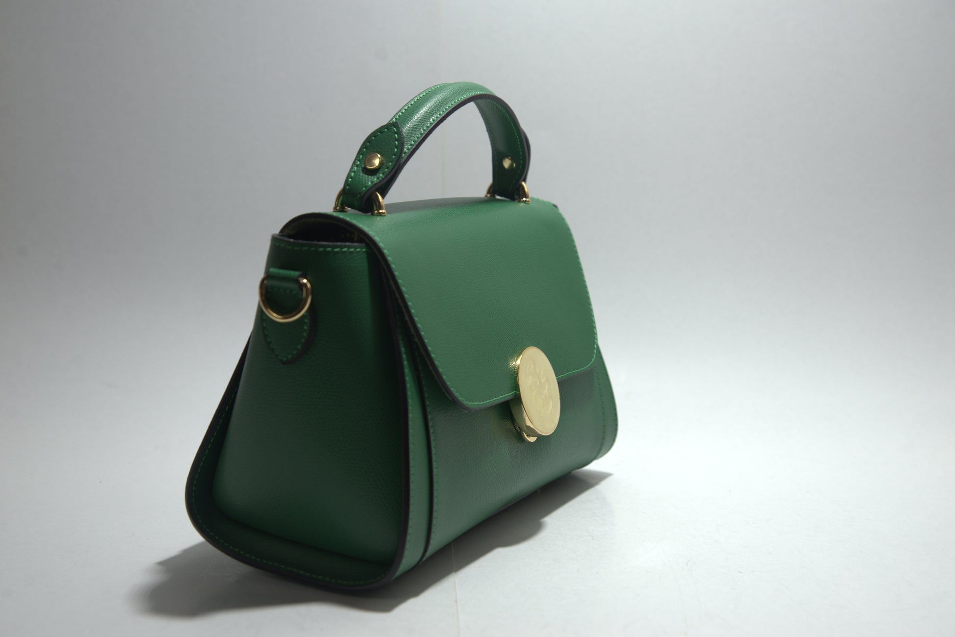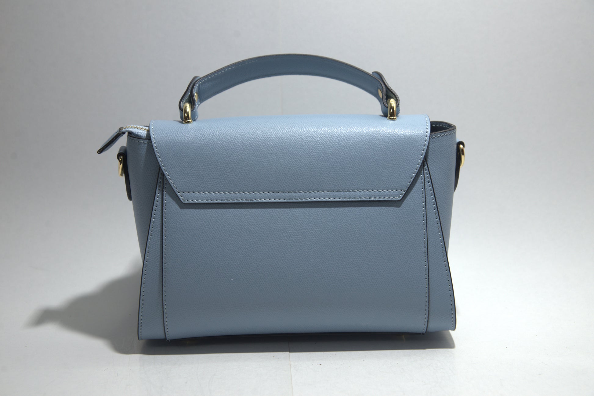 Această poșetă elegantă și structurată este perfectă pentru orice ocazie. Designul său sofisticat include o clapetă frontală cu închidere rotundă, metalică, de culoare aurie, care adaugă un plus de rafinament. Poșeta este prevăzută cu un mâner robust, atașat cu elemente metalice aurii, oferind atât stil, cât și funcționalitate. De asemenea, dispune de atașamente laterale pentru o curea de umăr, oferind versatilitate în purtare. Exteriorul texturat adaugă un aspect modern și distinctiv, făcând această poșetă un accesoriu de nelipsit din garderoba oricărei femei.